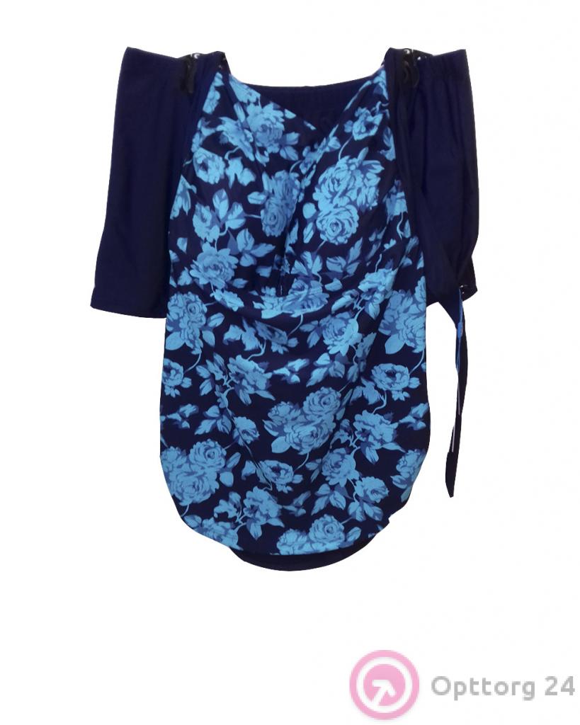 Купальник-майка с шортиками. Майка украшена изображением голубых цветов, шортики синего цвета, однотонные.