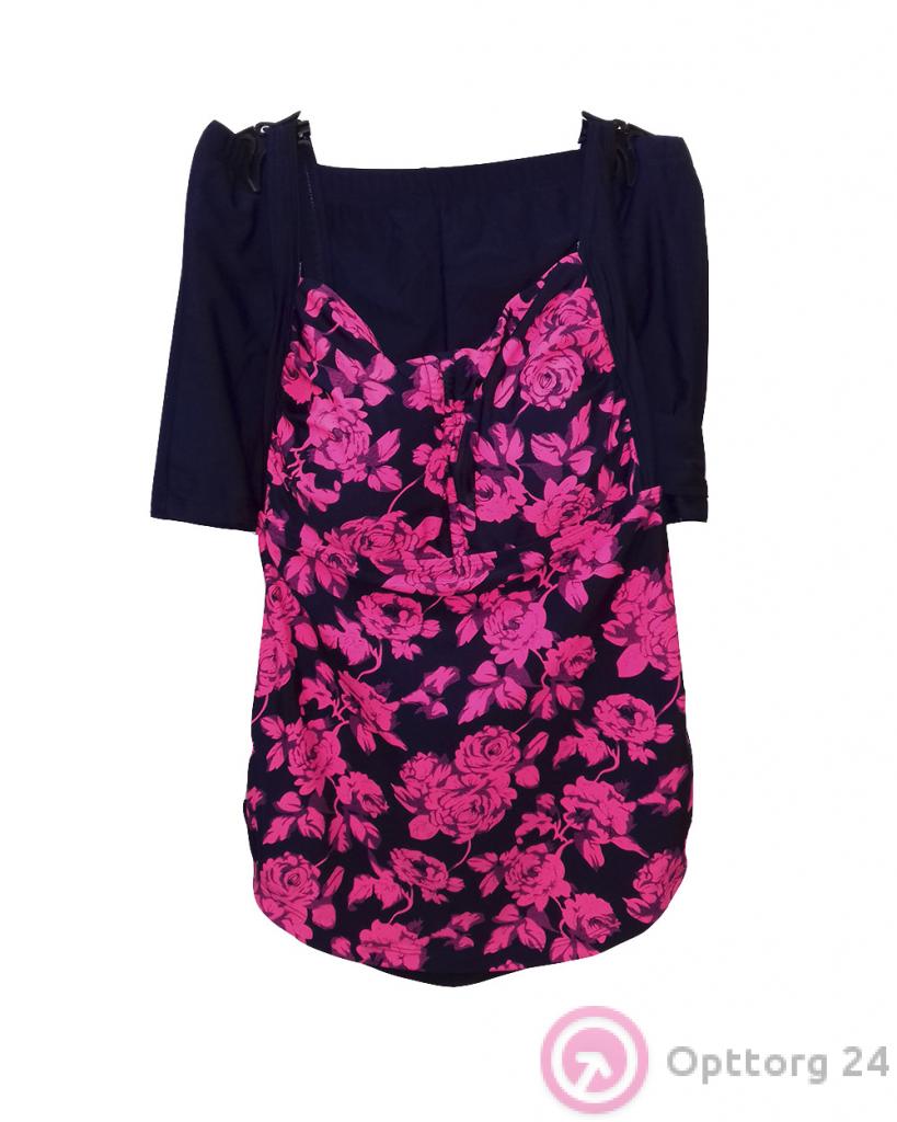 Купальник с удлиненной майкой и шортиками. Модель на бретельках, шортики однотонные, майка с принтом.