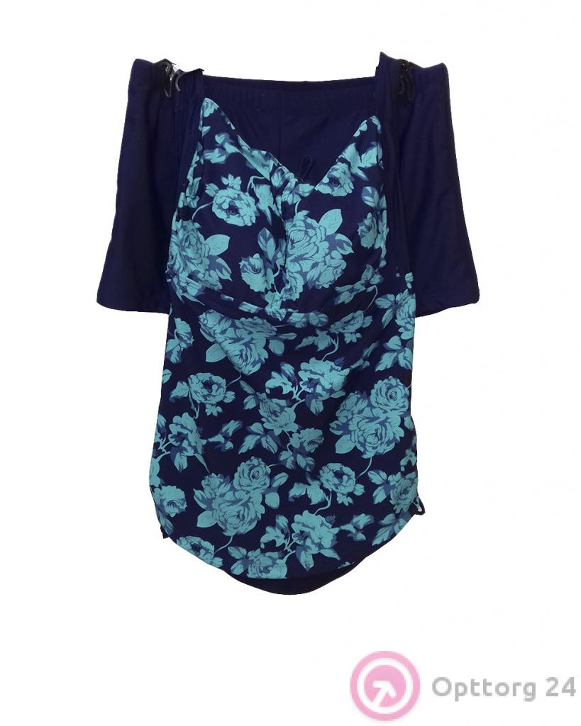 Модный купальник состоящий из майки и плавок-шортиков. Майка украшена цветастым принтом, шорты синие однотонные.