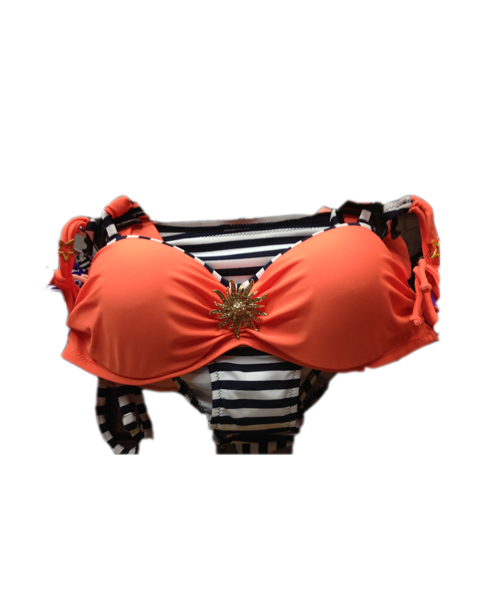 Стильный раздельный купальник выполнен из качественной ткани персикового и темно синего цвета. Бюстгальтер с красивой брошкой отлично приподнимает грудь и придает декольте соблазнительные формы. Чашечки плотные, на каркасах. Лиф завязывается на шнурочки. Трусики со средней линией посадки в бело-синюю полоску и шнурочками по боках.