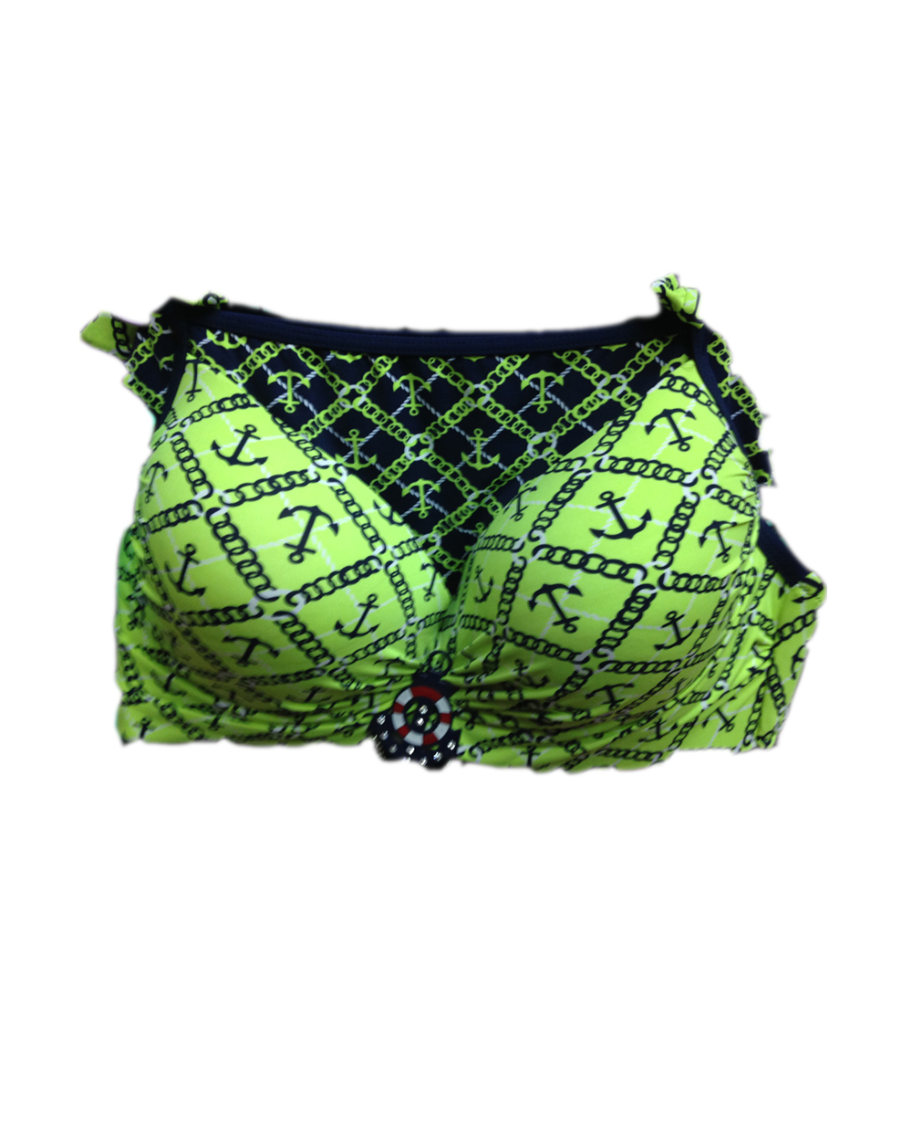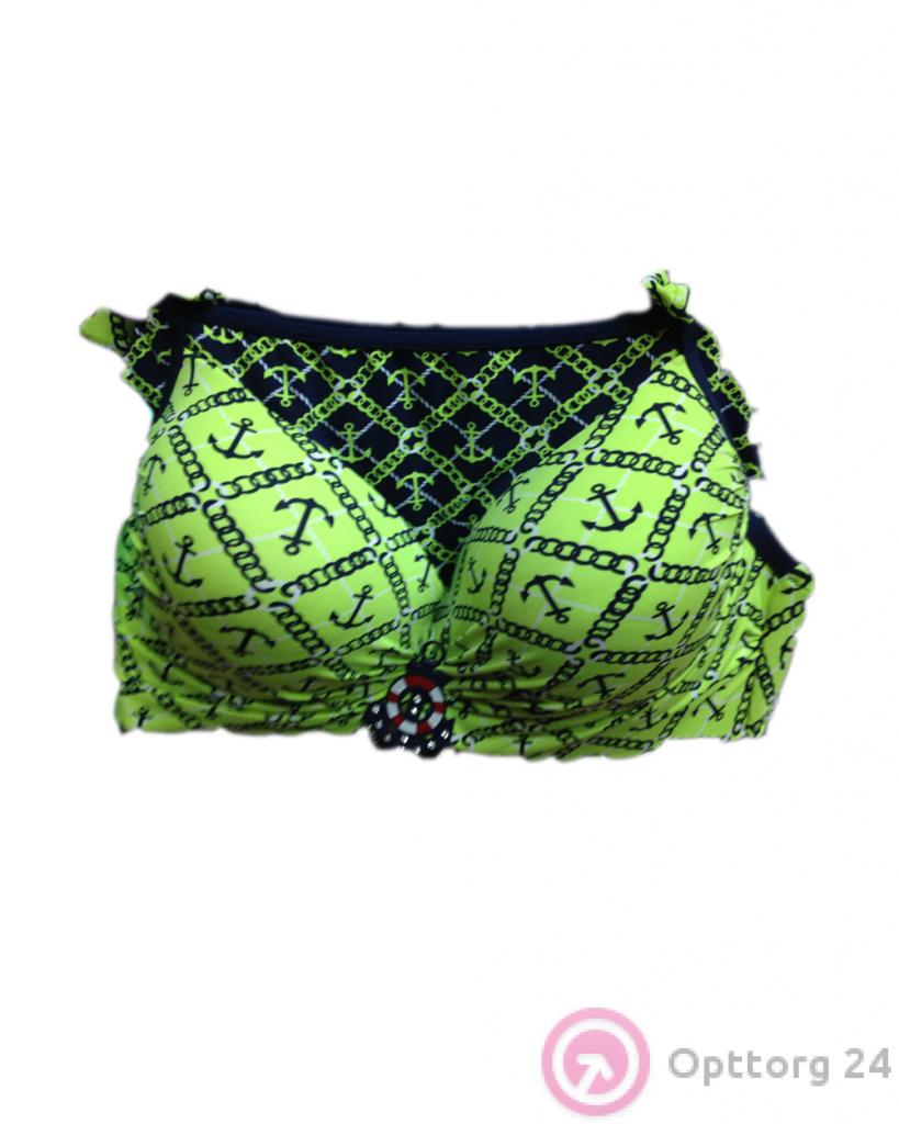 Красивый и комфортный раздельный купальник. Удобный бюстгальтер салатового цвета с принтом на морскую тематику хорошо поддерживает грудь. Качественная тканьо, модная расцветка. Купальник декорирован драпировками. Трусики со середней линией посадки, выполнены в темно-синем цвете с принтом.