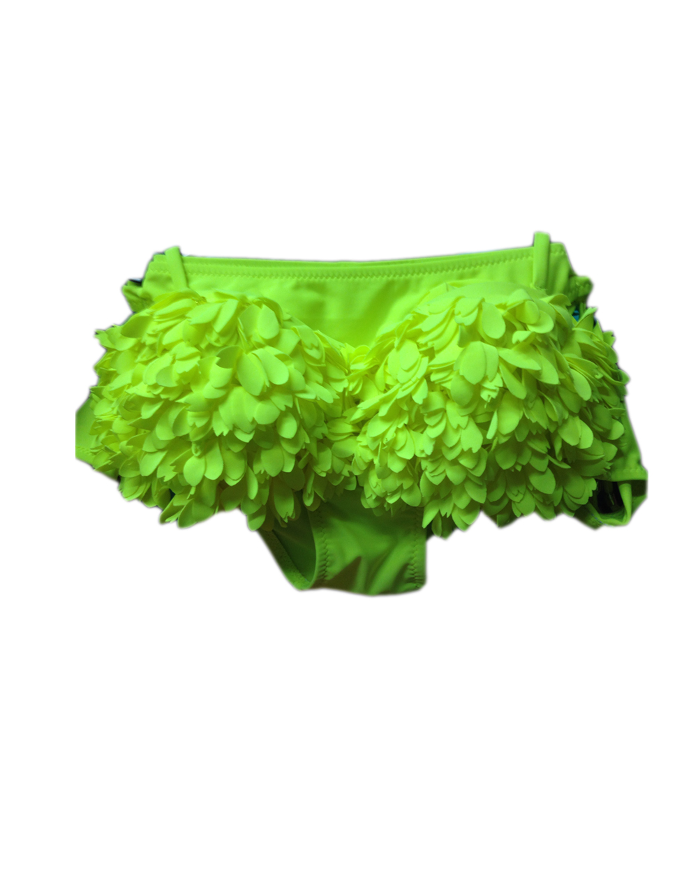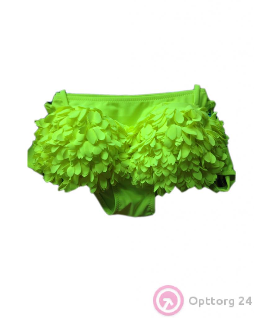 Стильный раздельный купальник выполнен из качественной ткани салатового оттенка. Бюстгальтер отделан цветами из ткани в тон купальнику, красиво приподнимает грудь и придает декольте соблазнительные формы. Чашечки плотные, на каркасах. Бретели регулируются по длине. Сзади бюстгальтера удобная и надежная фирменная застежка. Трусики со средней линией талии.