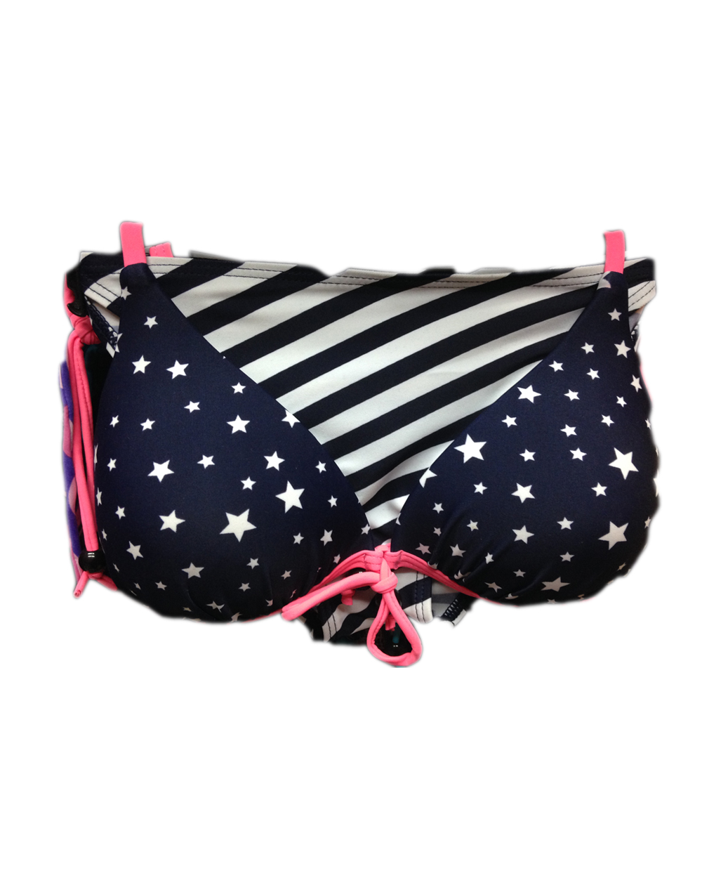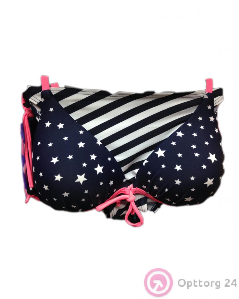 Красивый раздельный купальник выполнен из качественной ткани темно-синего цвета с принтом в виде небольших звездочек на лифе. Бюстгальтер с контрастным розовым шнурочком красиво приподнимает грудь и придает декольте соблазнительные формы. Чашечки плотные, на каркасах. Лиф завязывается на шнурочки. Трусики со средней линией талии в бело-синюю полоску и шнурочками по боках.