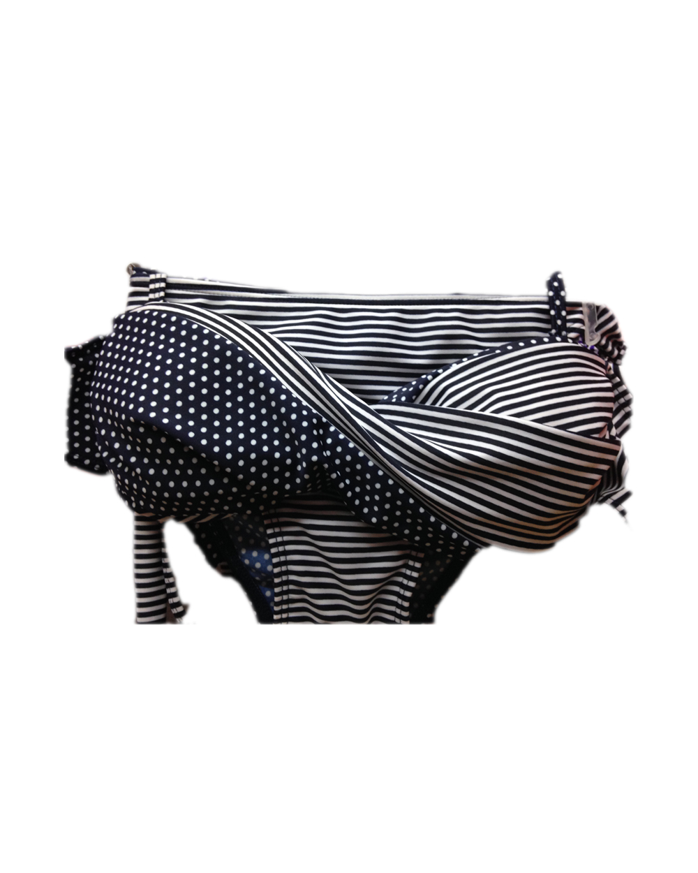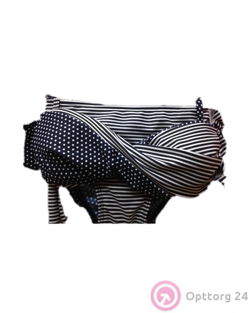 Оригинальный раздельный купальник выполнен из качественной ткани темно-синего цвета в мелкую полоску. Бюстгальтер красиво приподнимает грудь и придает декольте соблазнительные формы. Чашечки плотные, на каркасах. Лиф завязывается на шнурочки, оригинальный пошив, комбинация двух видов ткани: в мелкую полоску и мелкий горошек. Трусики со средней линией талии в бело-синюю полоску и шнурочками по боках.