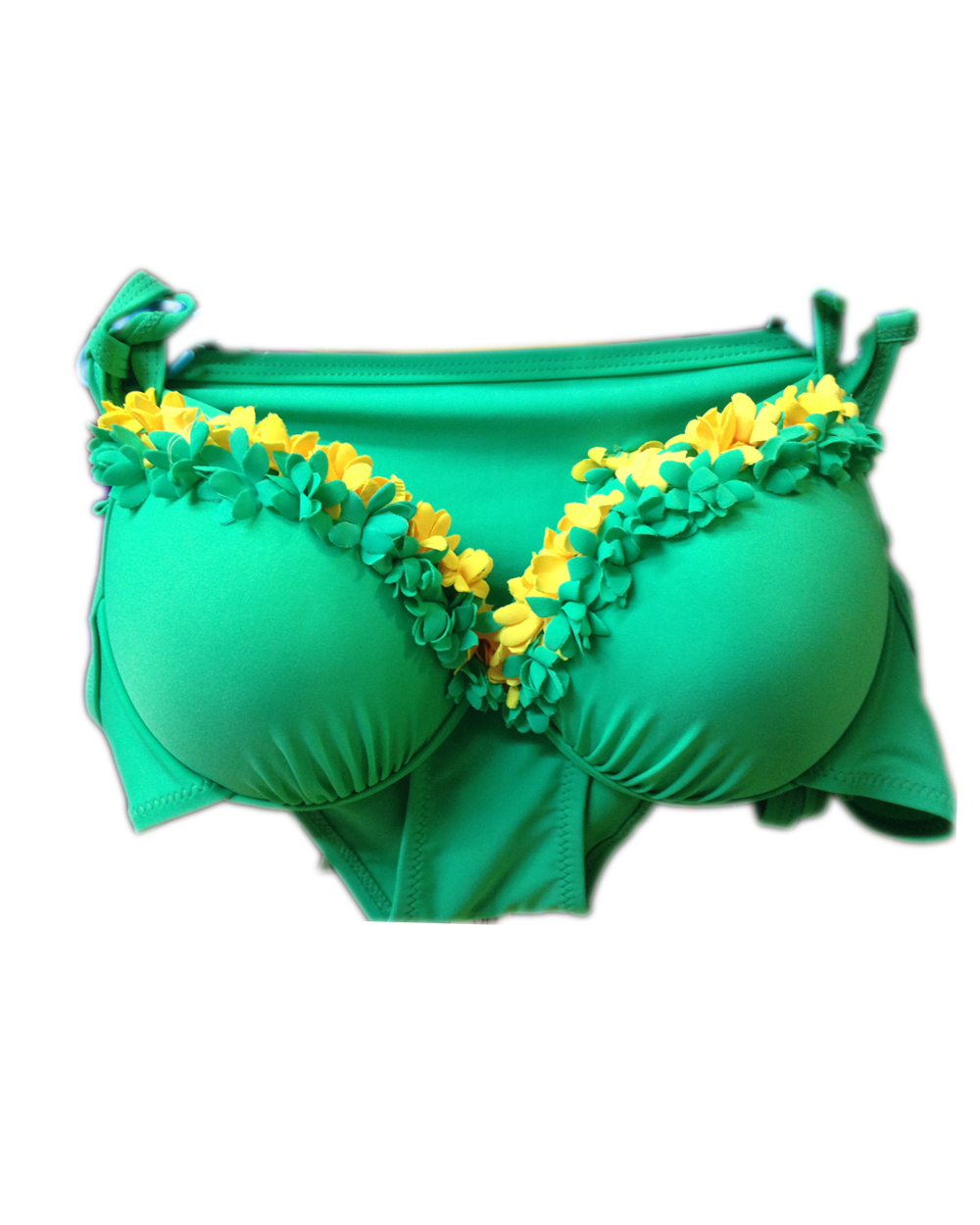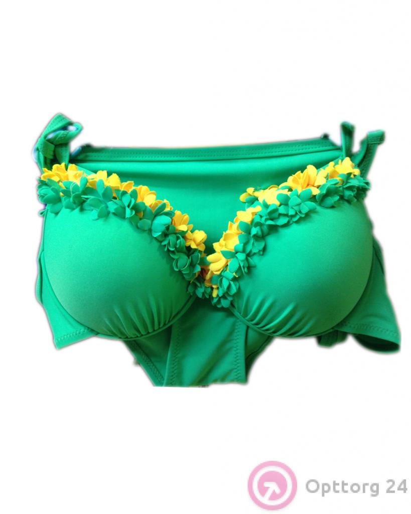 Очень красивый раздельный купальник выполнен из качественной ткани зеленого цвета. Бюстгальтер красиво приподнимает грудь и придает декольте соблазнительные формы. Чашечки плотные, на каркасах. Бретели регулируются по длине. Сзади бюстгальтера удобная и надежная фирменная застежка. Украшение купальника - отделка лифа в виже цветов зеленого и желтого цвета. Трусики со средней линией талии.