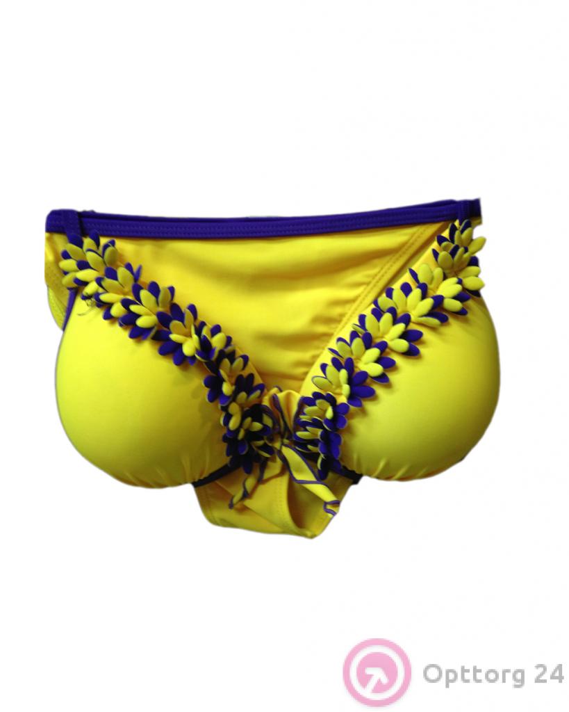 Роскошный раздельный купальник выполнен из качественной ткани желтого цвета. Бюстгальтер красиво приподнимает грудь и придает декольте соблазнительные формы. Чашечки плотные, на каркасах. Бретели регулируются по длине. Сзади бюстгальтера удобная и надежная фирменная застежка. Яркое украшение - желто-фиолетовые цветы на лифе. Трусики со средней линией талии с фиолетовой отделкой.