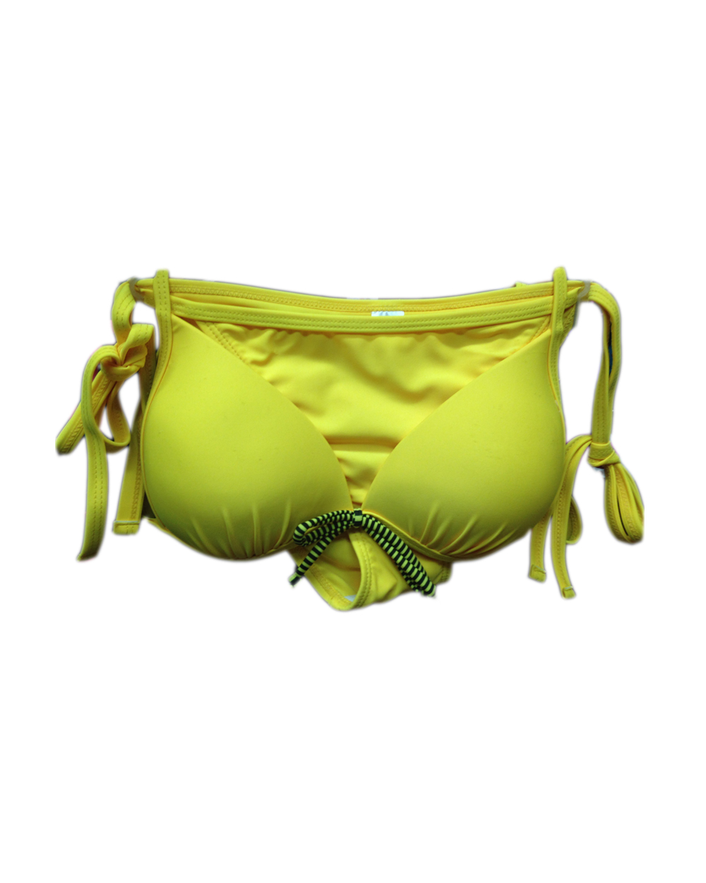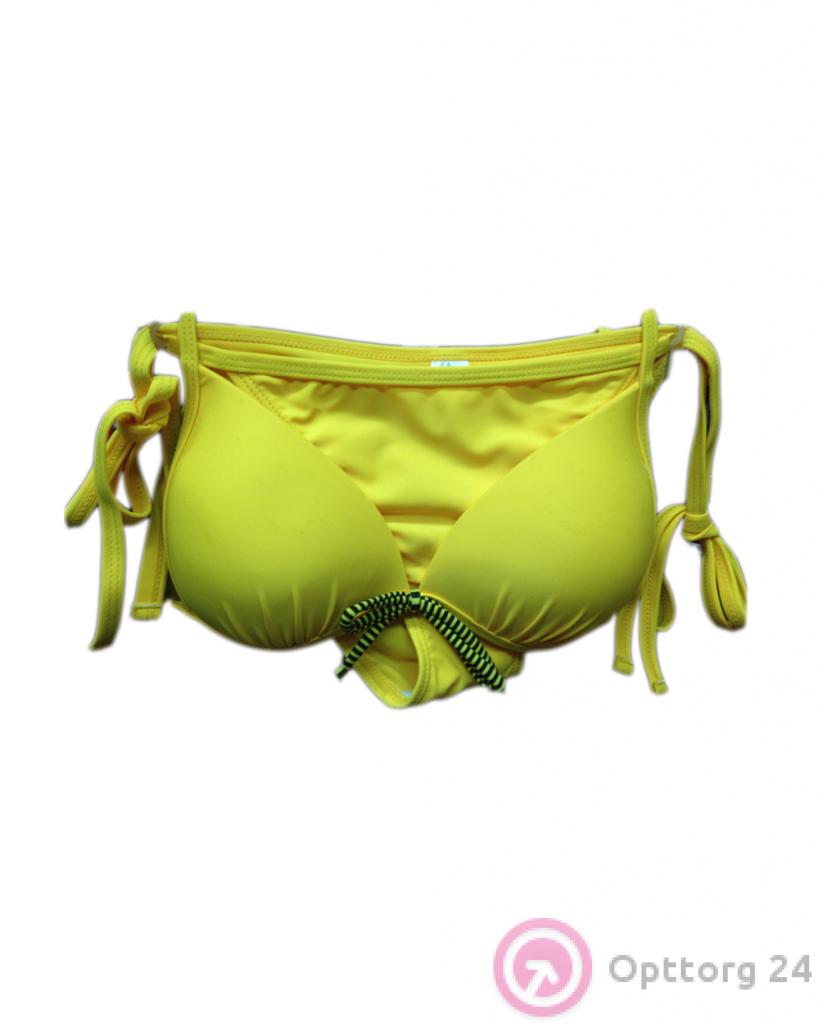 Красивый раздельный купальник выполнен из качественной ткани желтого цвета. Бюстгальтер с контрастным шнурочком красиво приподнимает грудь и придает декольте соблазнительные формы. Чашечки плотные, на каркасах. Лиф завязывается на шнурочки. Трусики со средней линией талии и шнурочками по боках.