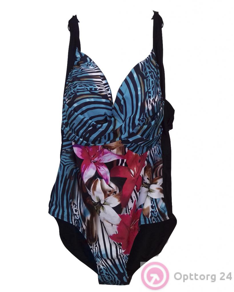 Купальник слитный бирюзовый с темными полосками и цветами оптом