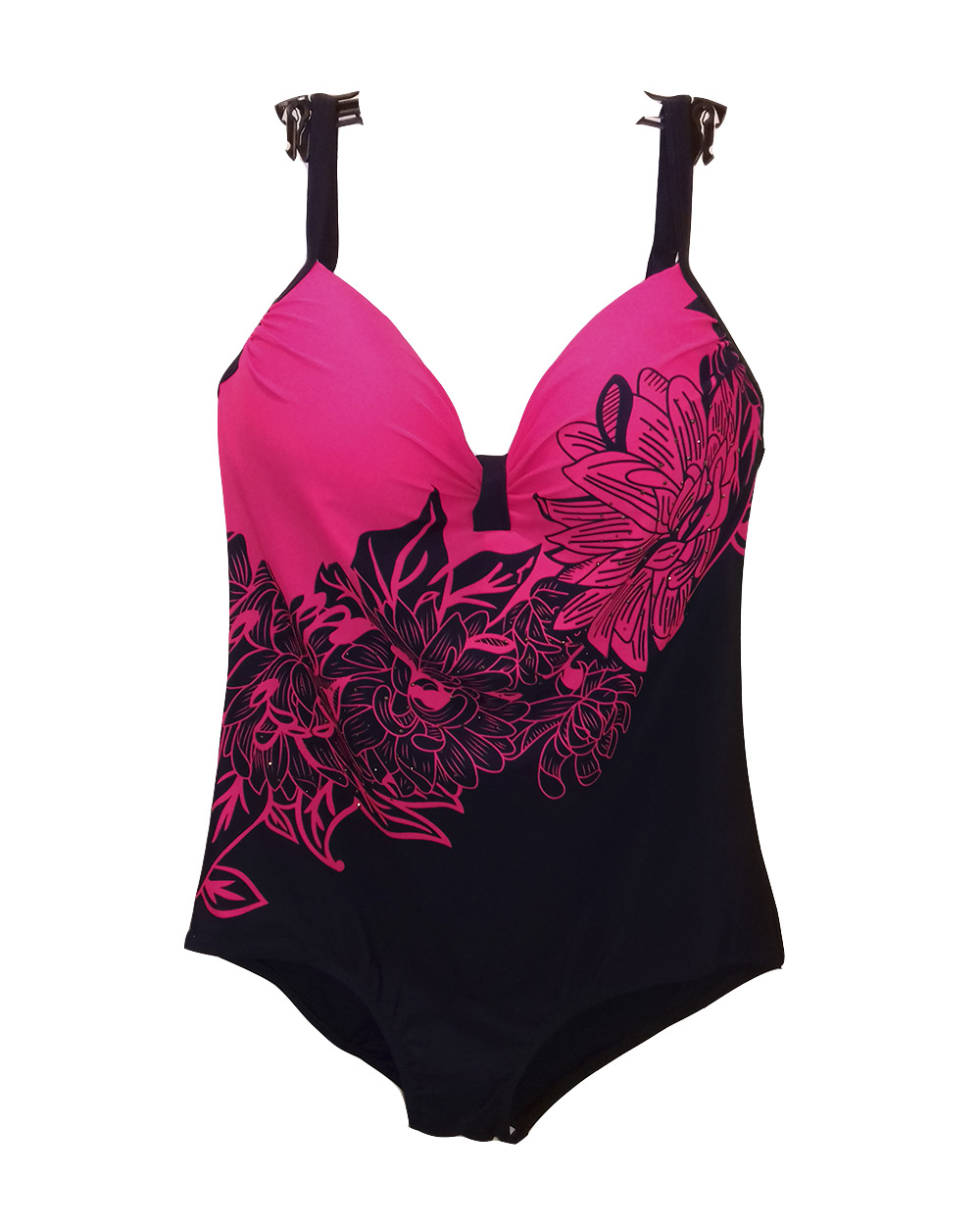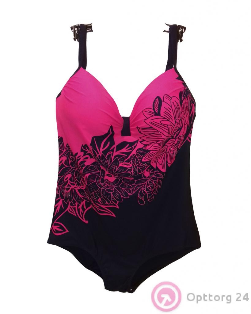 Оригинальный черно розовый купальник с цветочным принтом. Формированные чашечки, тонкие бретели.