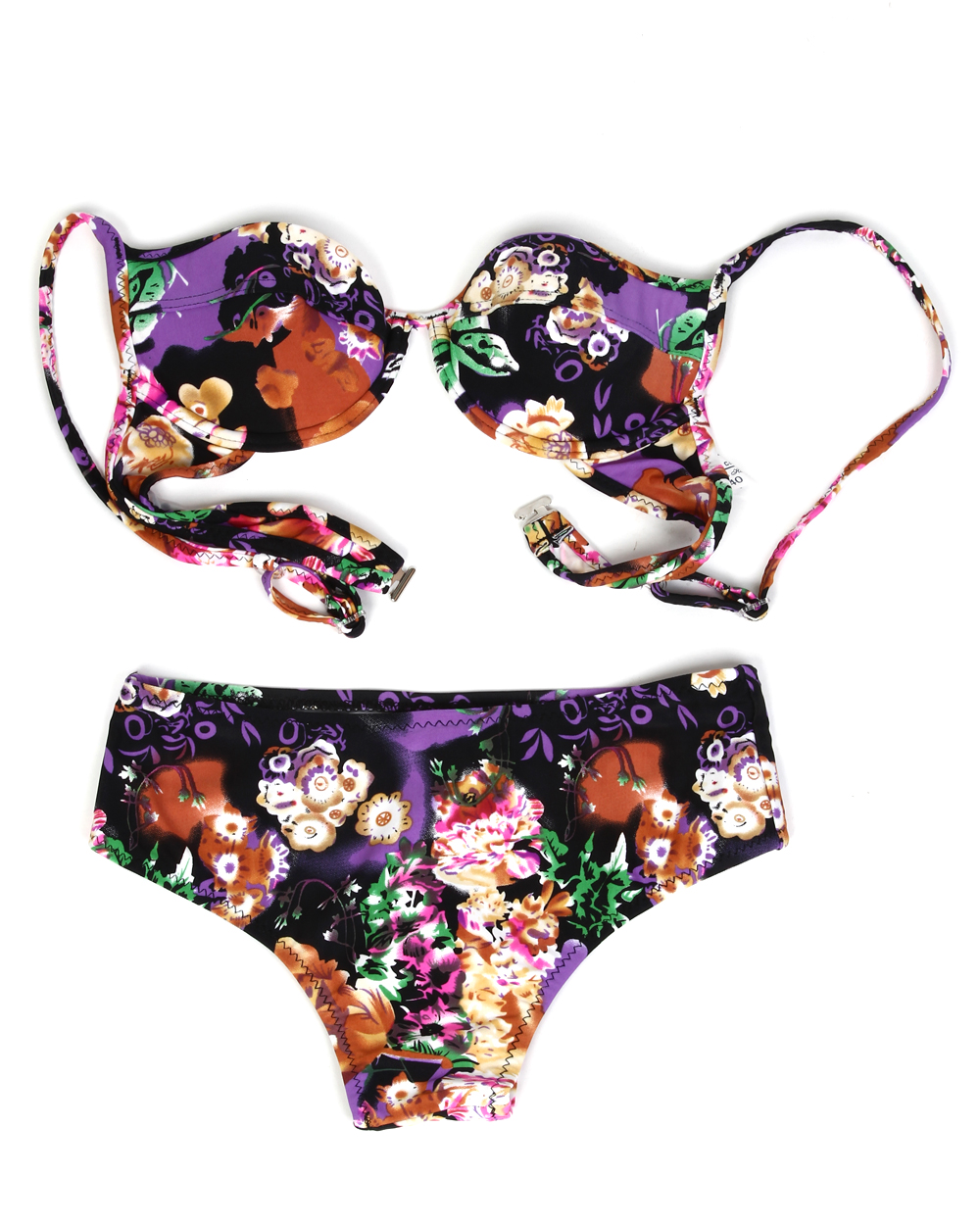 Этот черный угольный купальник невероятно удачно разбавляет свой насыщенный оттенок сочным и ярким тропическим принтом, создавая прекрасную цветовую композицию.