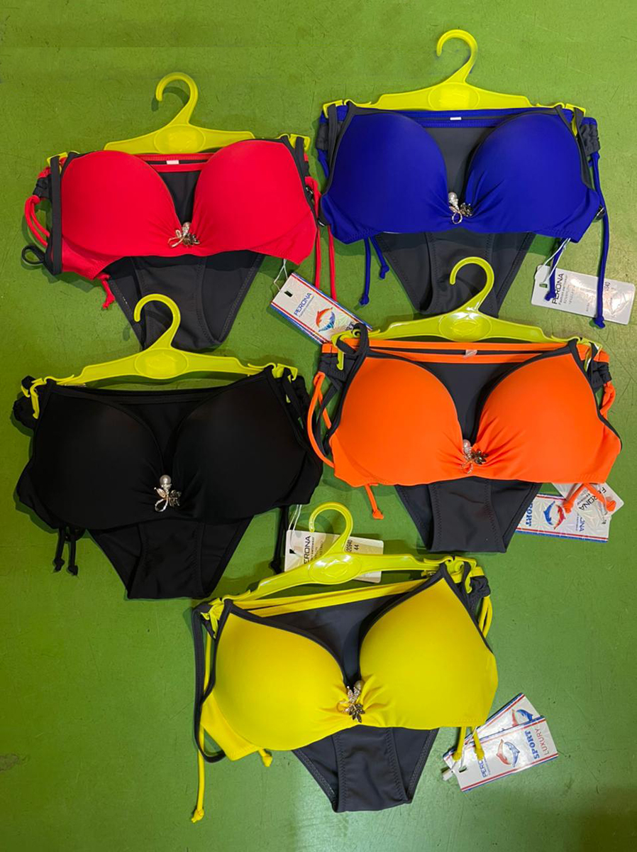 Описание: Купальник женский открытый яркой расцветки, на тоненьких бретелях. Лиф украшен брошью. Трусики с завязочками. Мягкая чашечка.