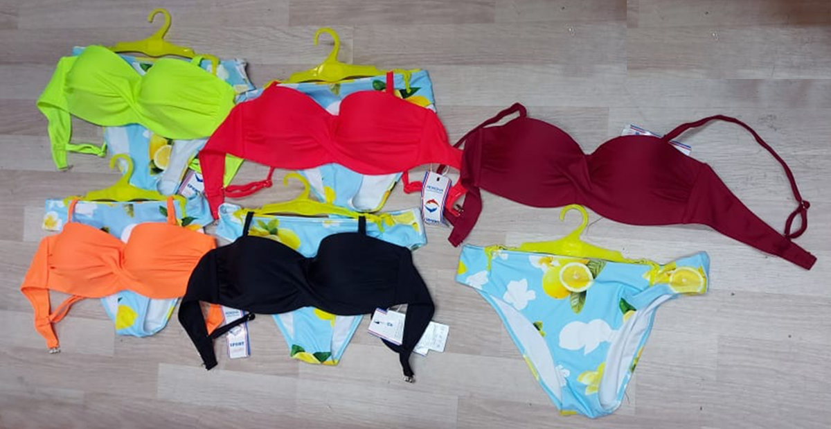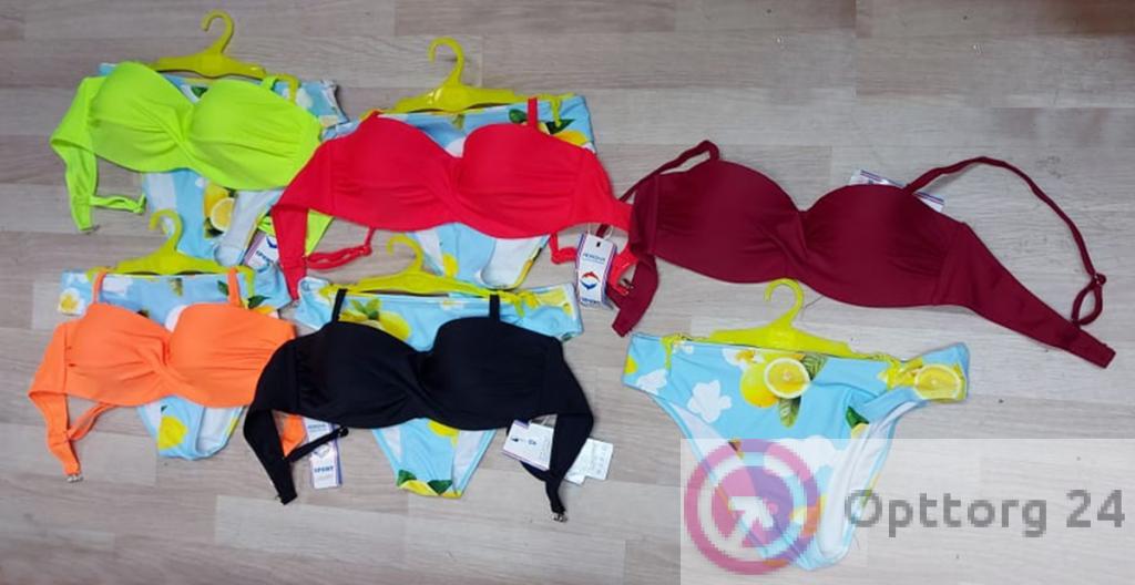 Описание: Купальник женский открытый на тонких бретелях. Трусики нежно-голубого цвета с принтом лимонов. Мягкая чашечка.