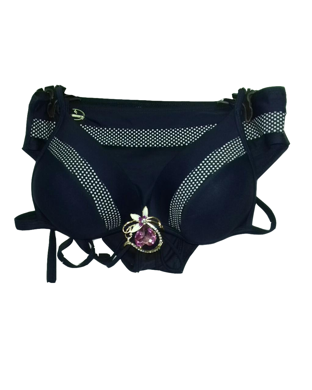 Оригинальный темно-сминий купальник с брошью на лифе. Модель состоит из трусиков-плавок и топа на бретелях.