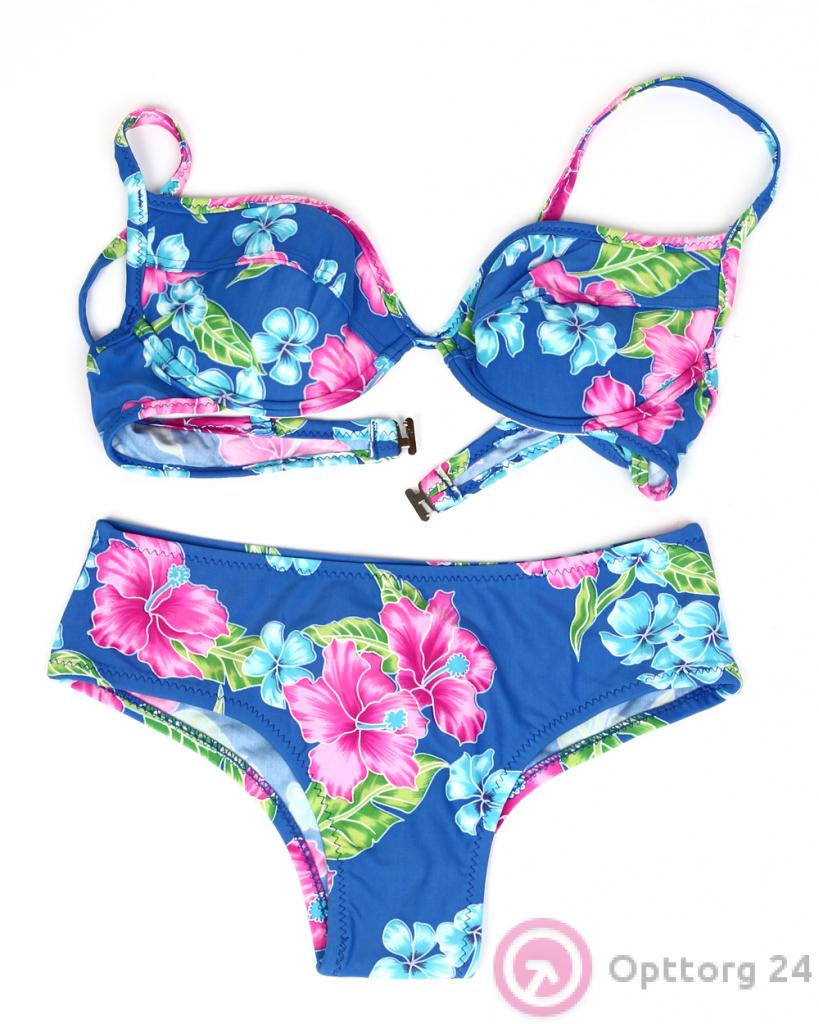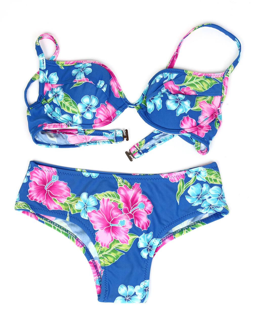 Насыщенный синий цвет этого купальника, декорированный крупными и контрастными цветами, невольно заставляет вспомнить жаркую Ямайку с их национальными цветочными костюмами.