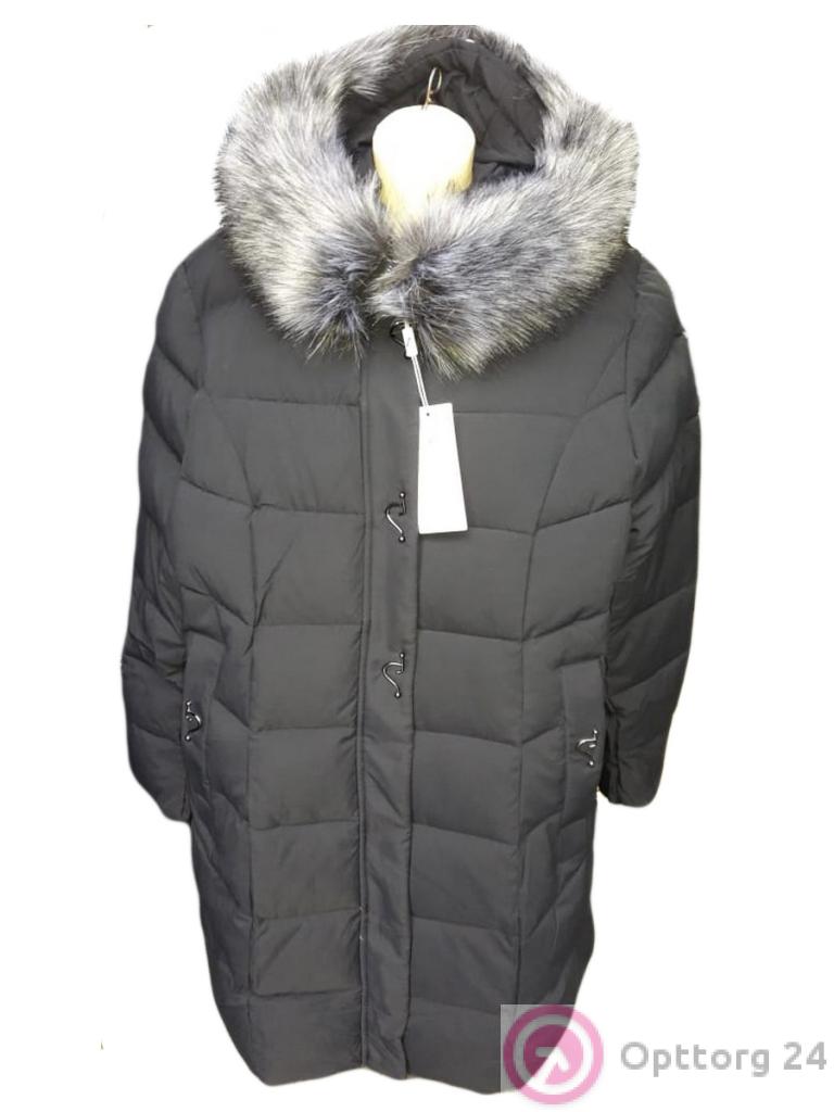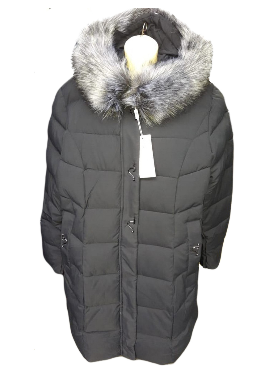 Женский черный пуховик длиной ниже колена в зимний период. Изделие имеет карманы спереди и капюшон с серым мехом. Свободный силуэт.