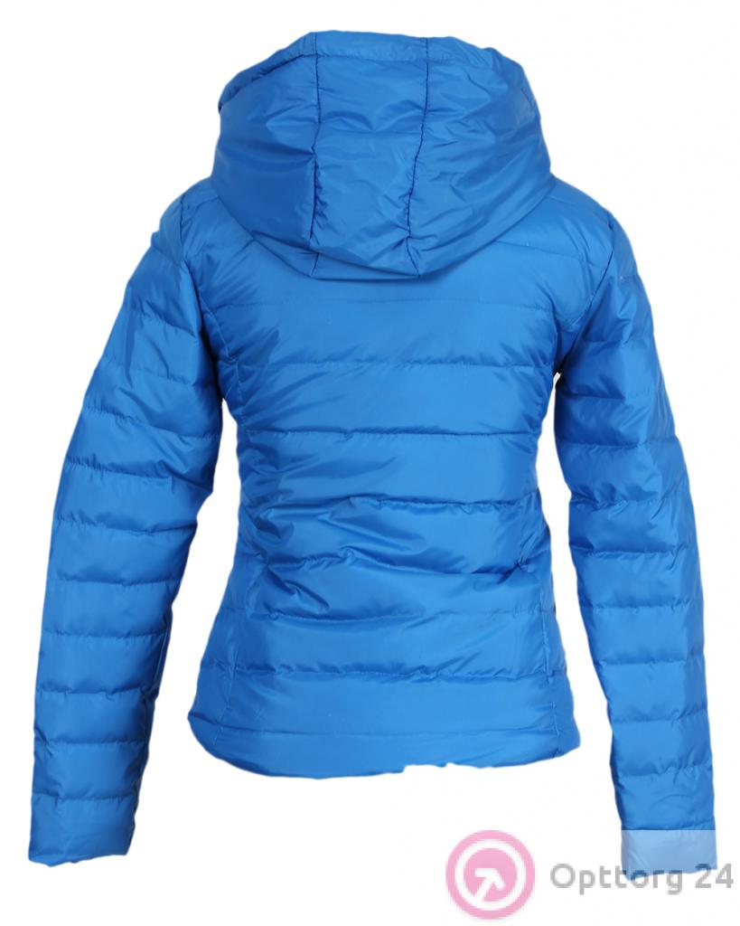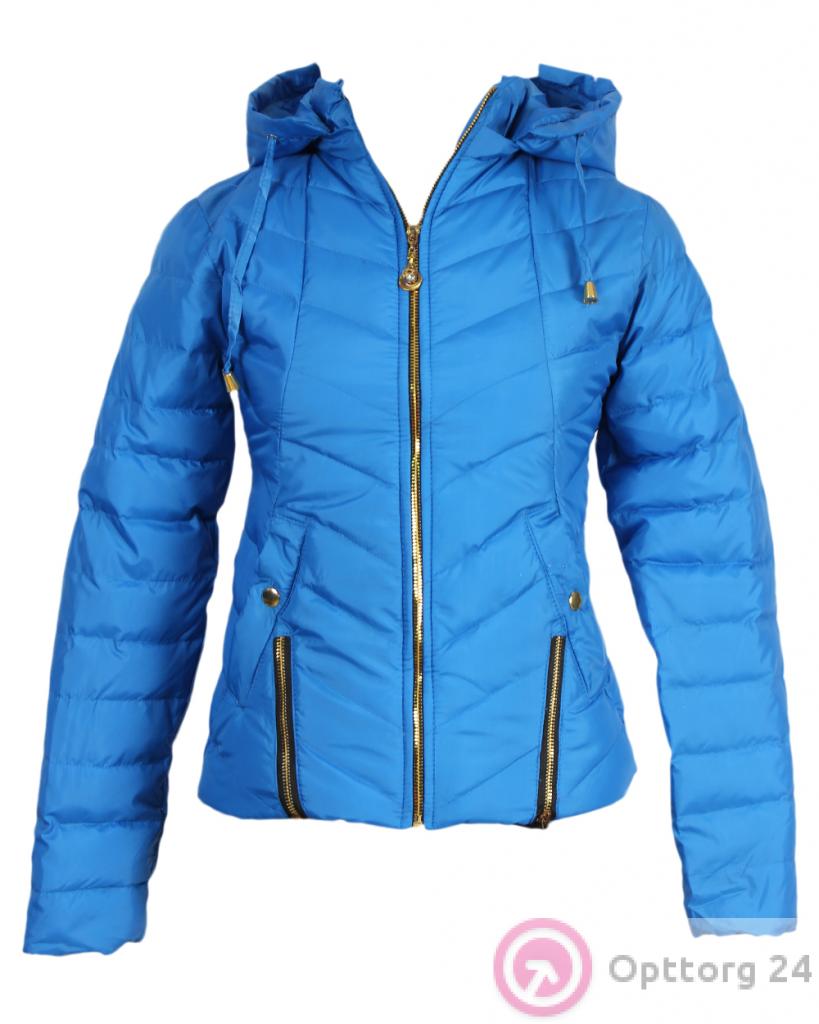 Оригинальная женская куртка голубого цвета с молнией по-боках снизу. Капюшон имеет шнурок-утяжку.