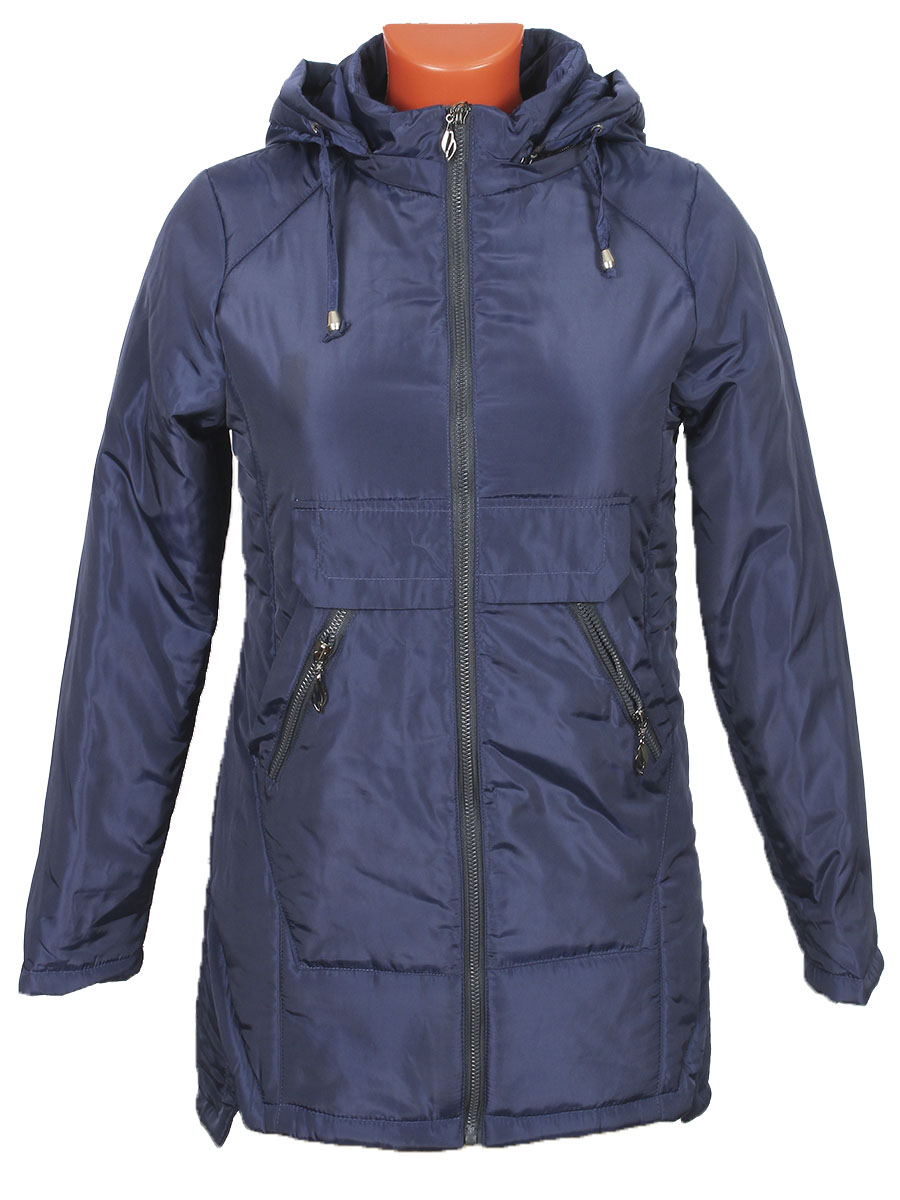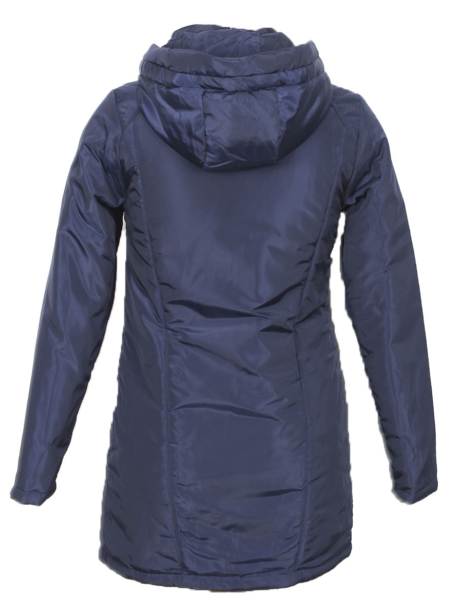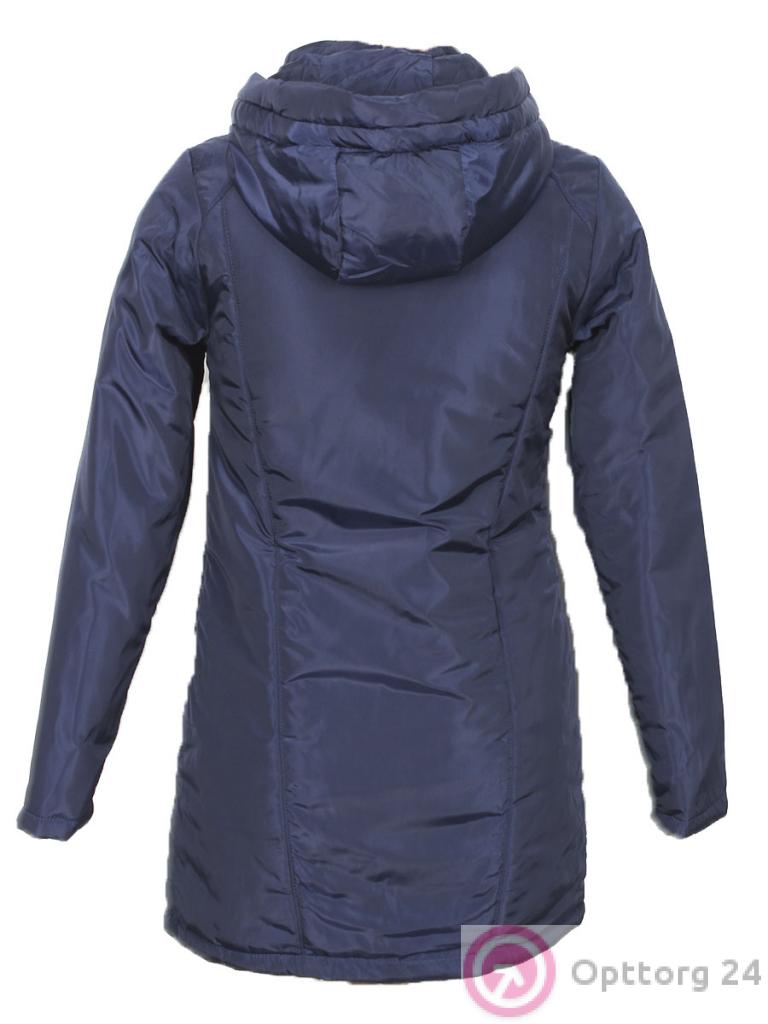 Женская удлинённая куртка темно-синего цвета с капюшоном.
