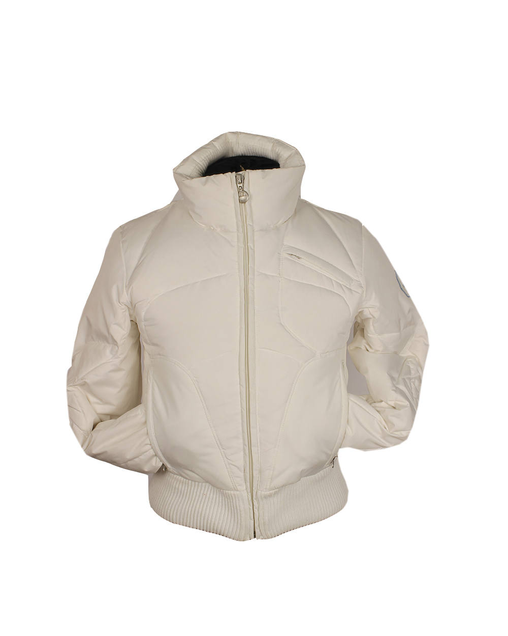 Изящная белая куртка укороченного кроя. Модель имеет высокий воротник-стойку и застегивается на молнию. В изделии есть два врезных кармана для разных мелочей.