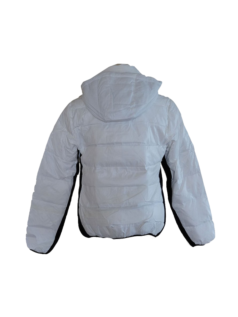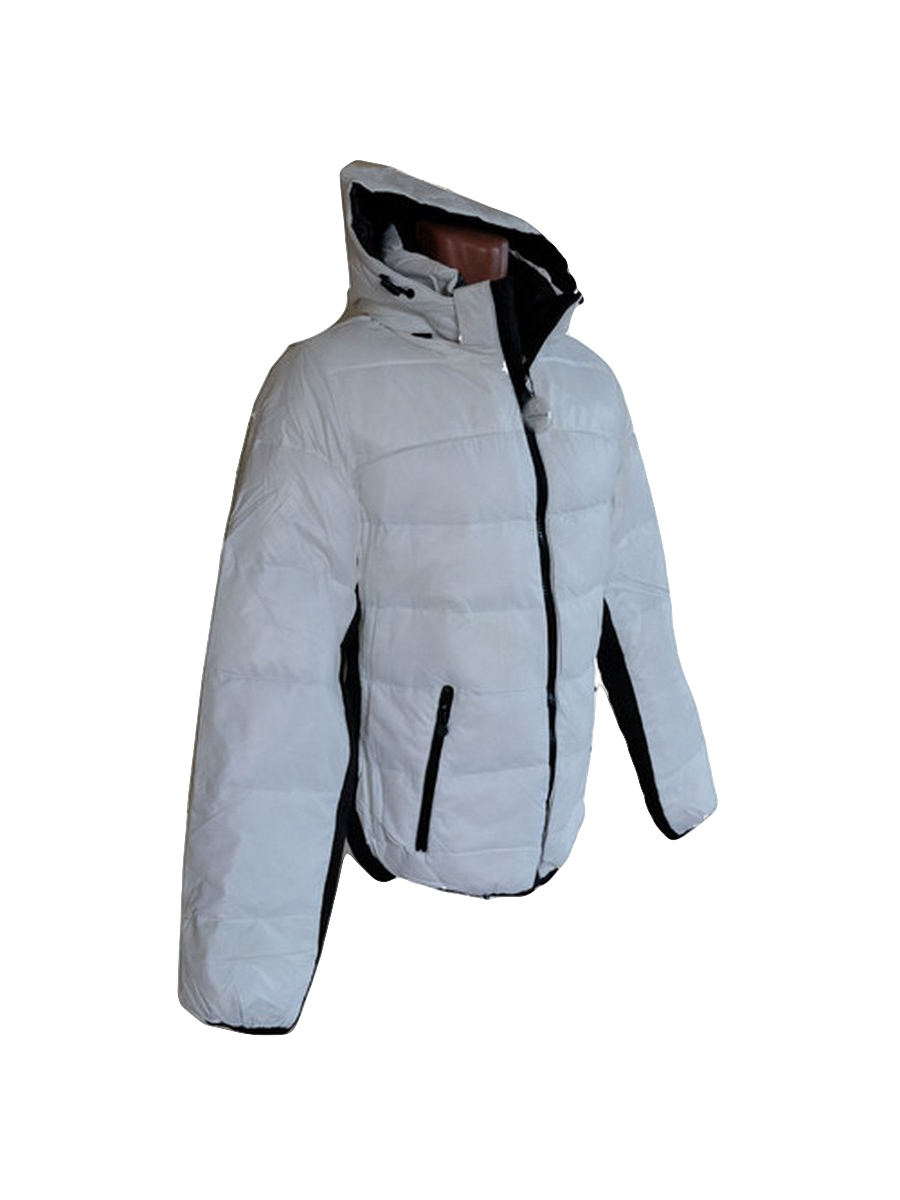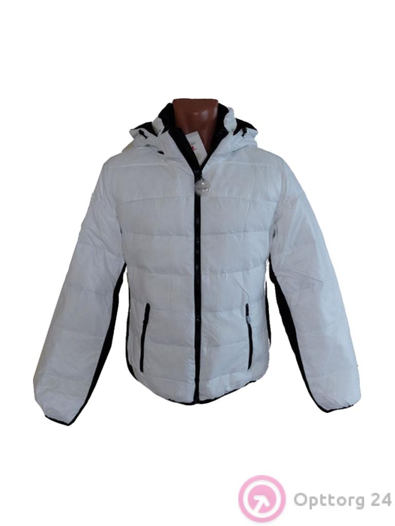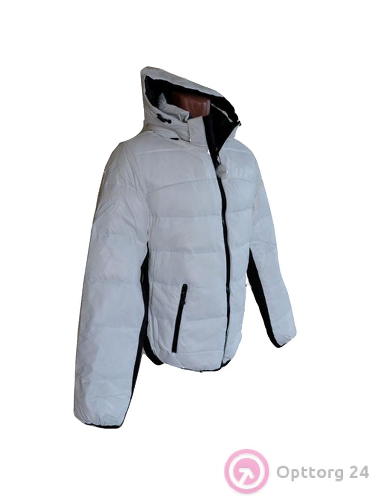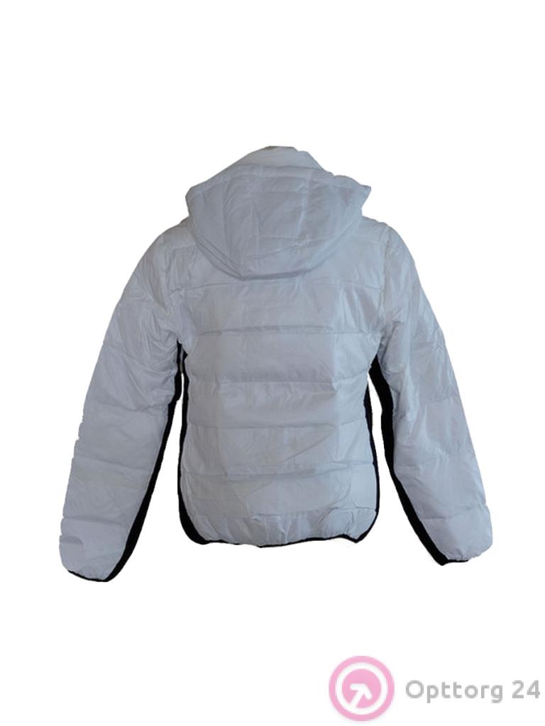 Зимняя облегченная куртка для женщин белого цвета. По середине черная молния. Спереди 2 кармана. Изделие длиной выше колена.