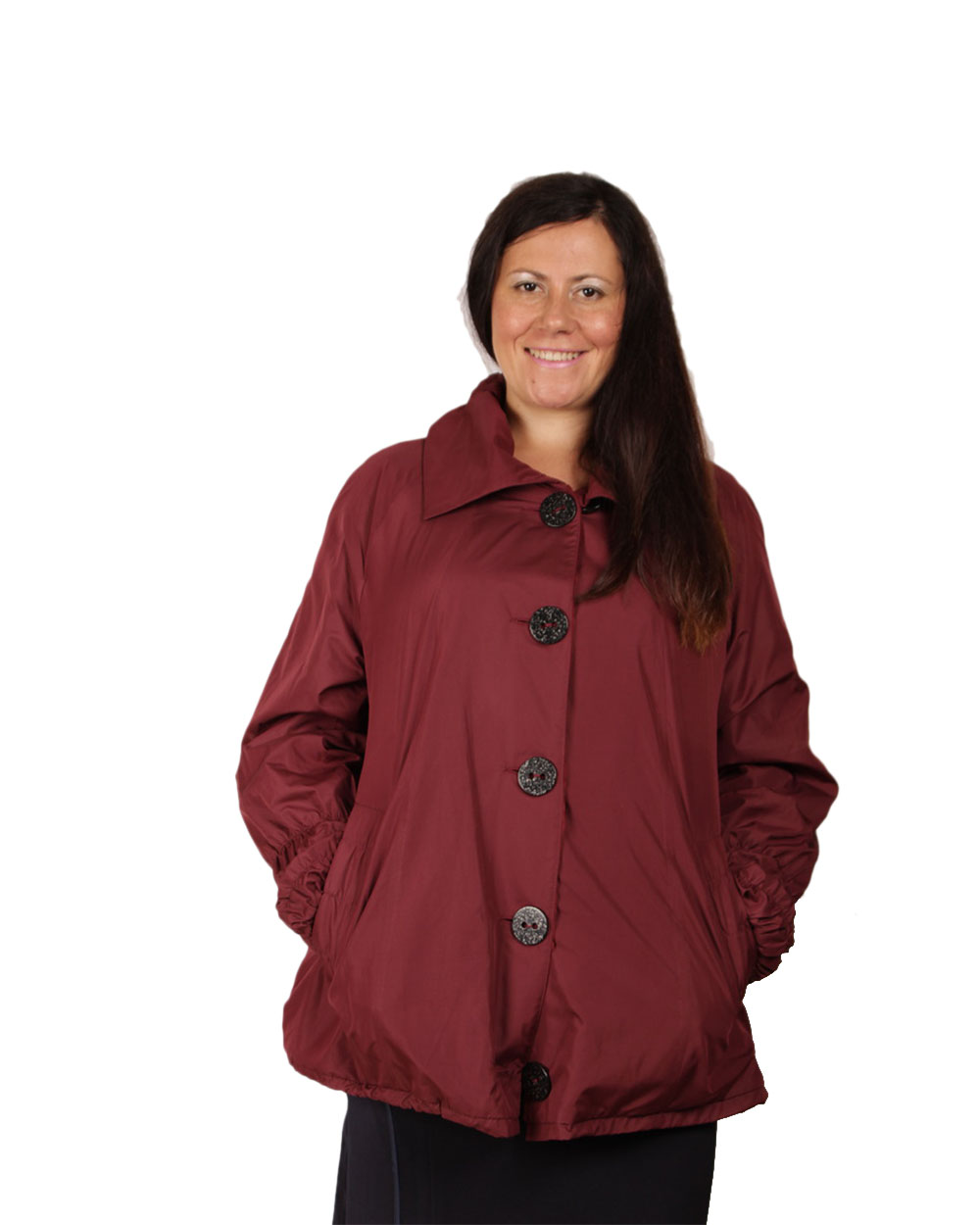 Симпатичная куртка свободного кроя. Изделие имеет бордовый цвет и большие пуговицы.