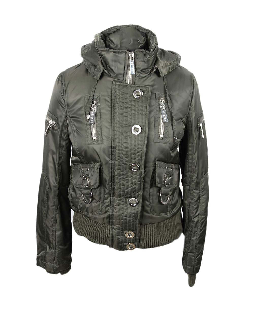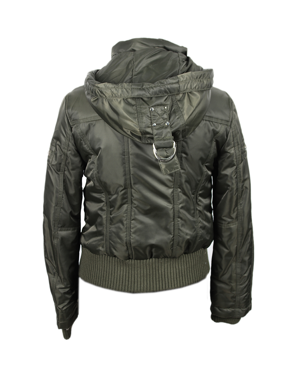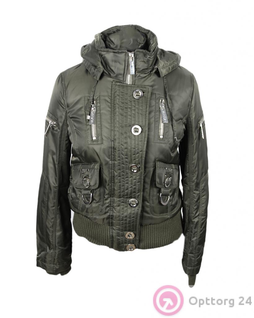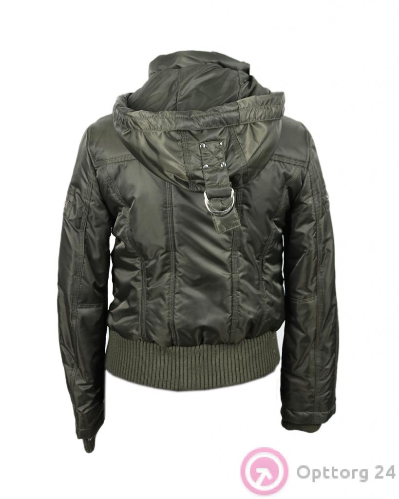 Женская куртка черного цвета с капюшоном. Изделие имеет трикотажные манжеты на рукавах.