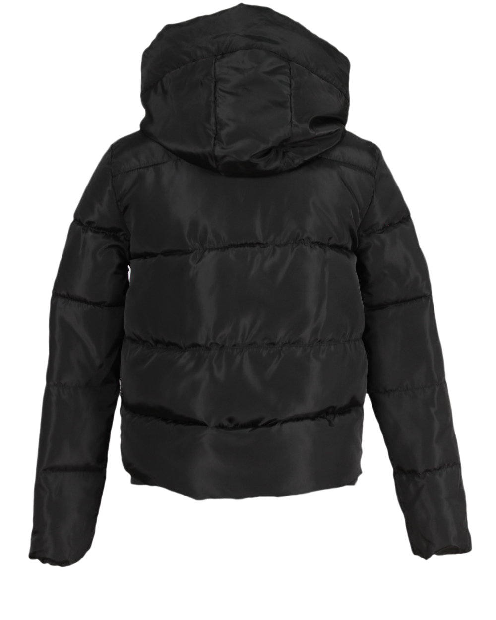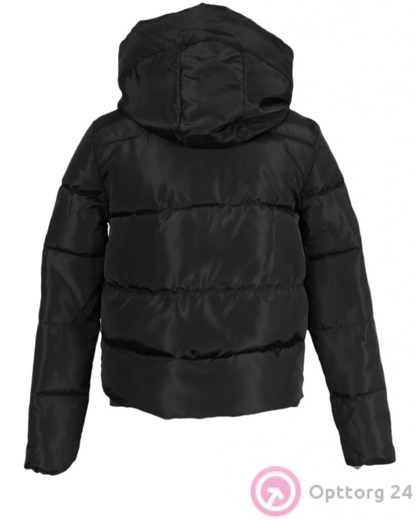 Женская куртка черного цвета с капюшоном. Прямой крой и карманы на молнии.
