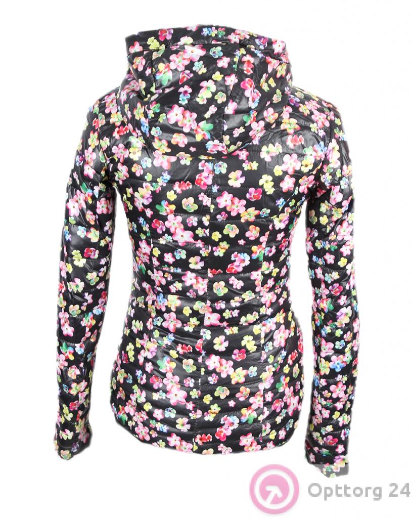 Куртка для женщин. Модель выполнена в черном цвете и имеет яркий принт. Карманы на молнии.