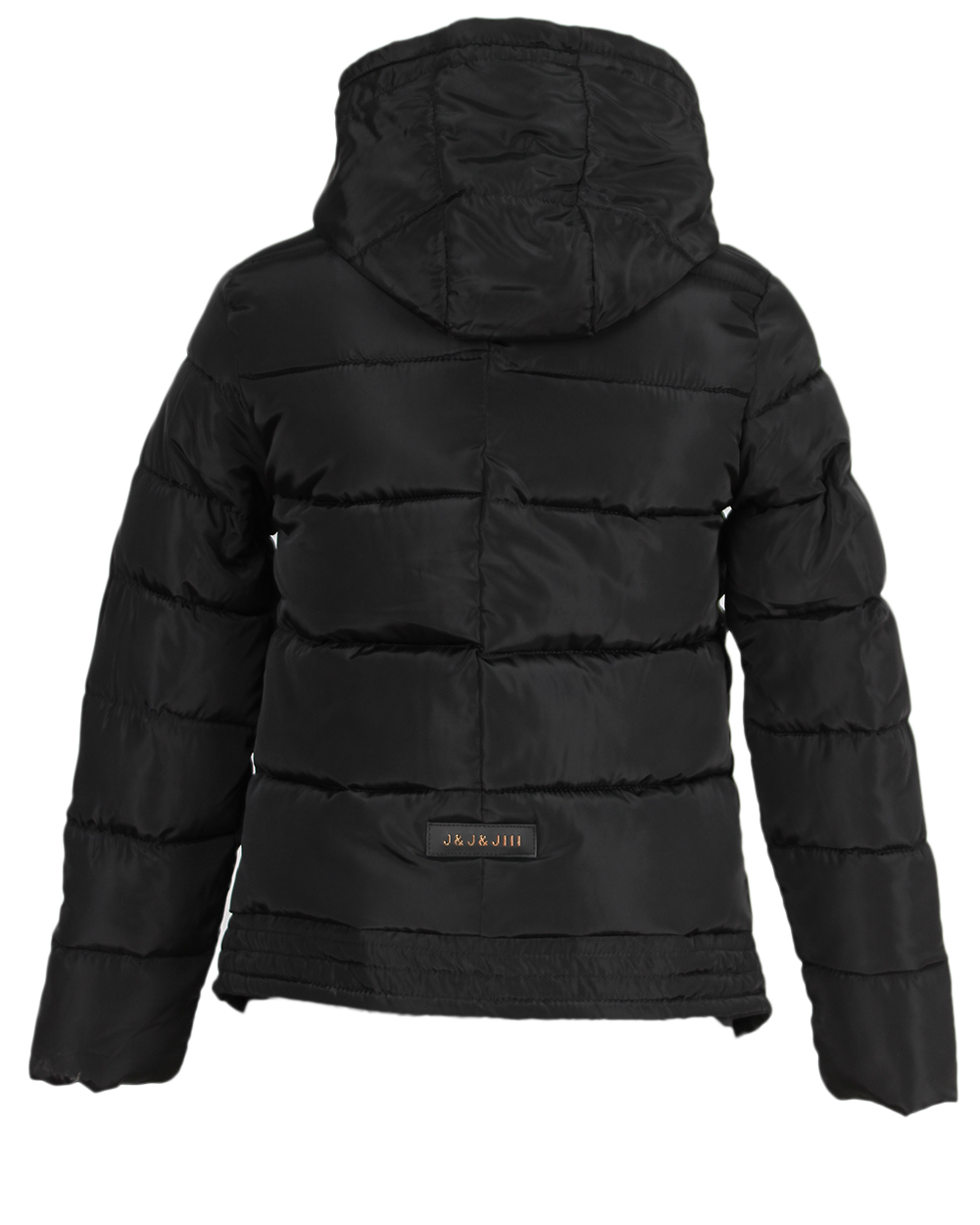 Молодежная куртка черного цвета с накладными карманами и нашивками спереди. Модель имеет капюшон и воротник-стойку.