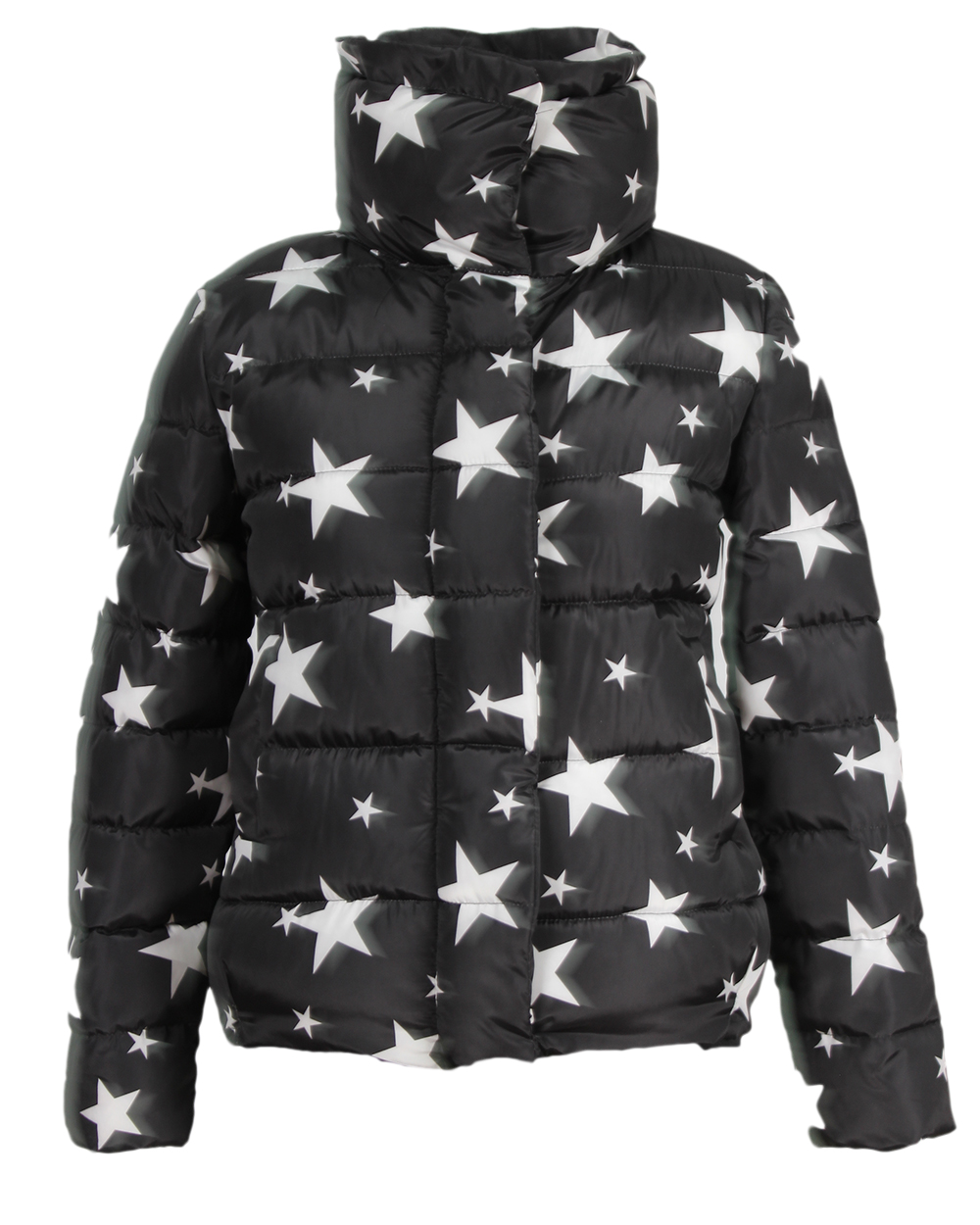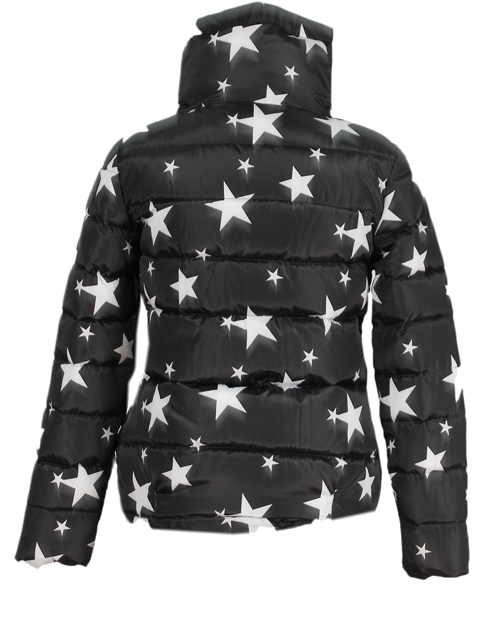 Куртка женская черного цвета с контрастными белыми звездочками. Модель имеет приталенный крой. Высокий воротник-стойка.