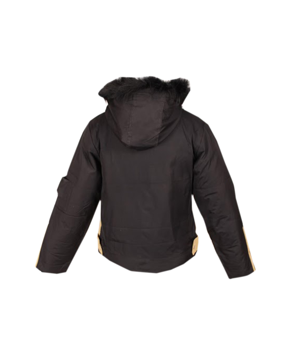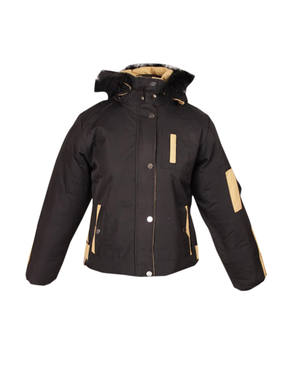 Симпатичная куртка приглушенного черного цвета. Модель красиво дополнена бежевыми вставками. На капюшоне есть небольшая меховая опушка.