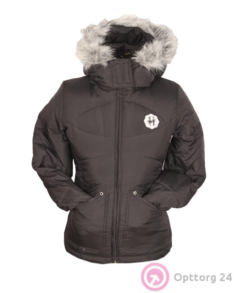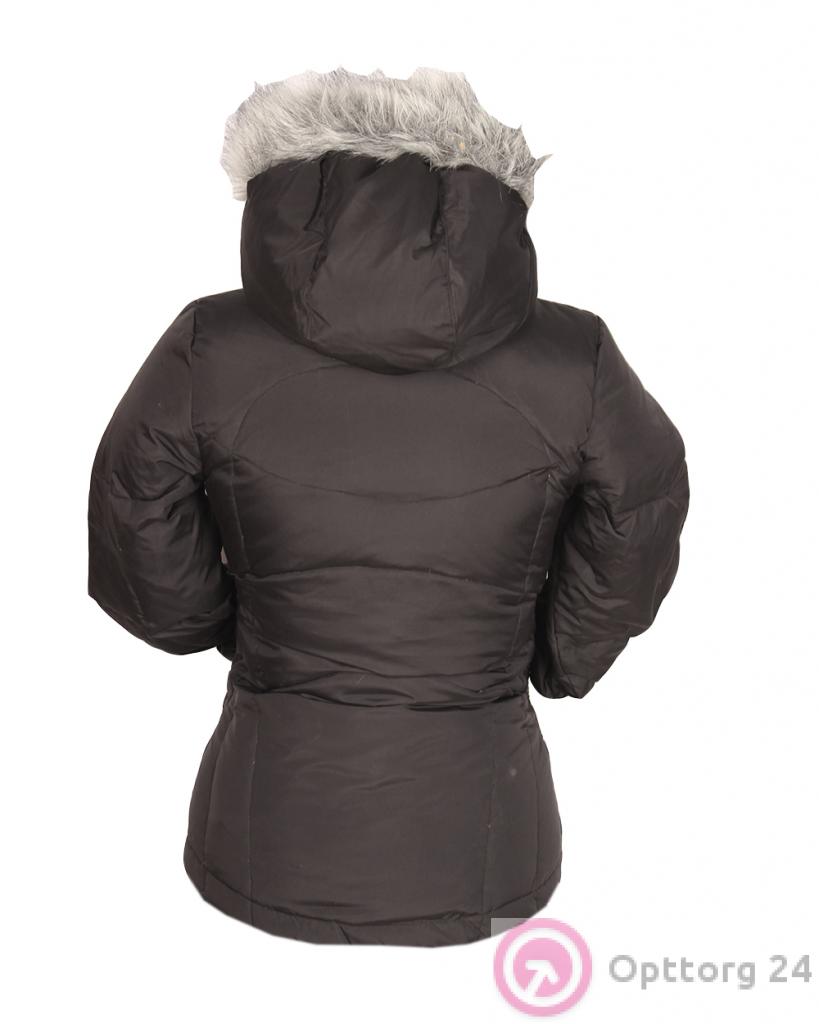 Куртка женская черного цвета с мехом на капюшоне оптом