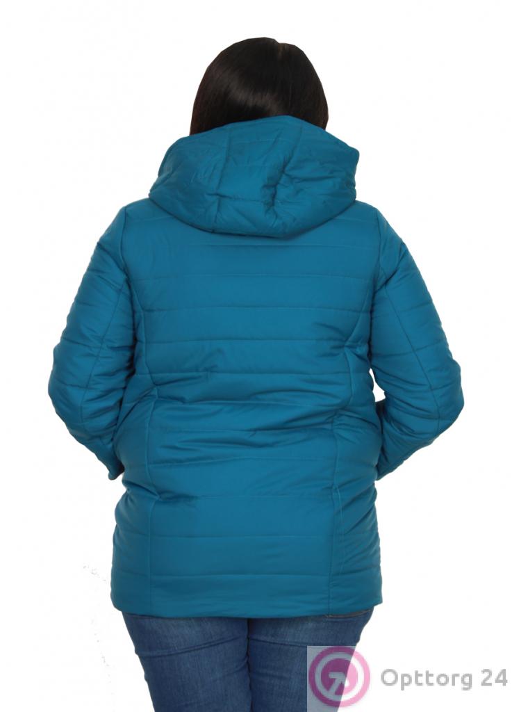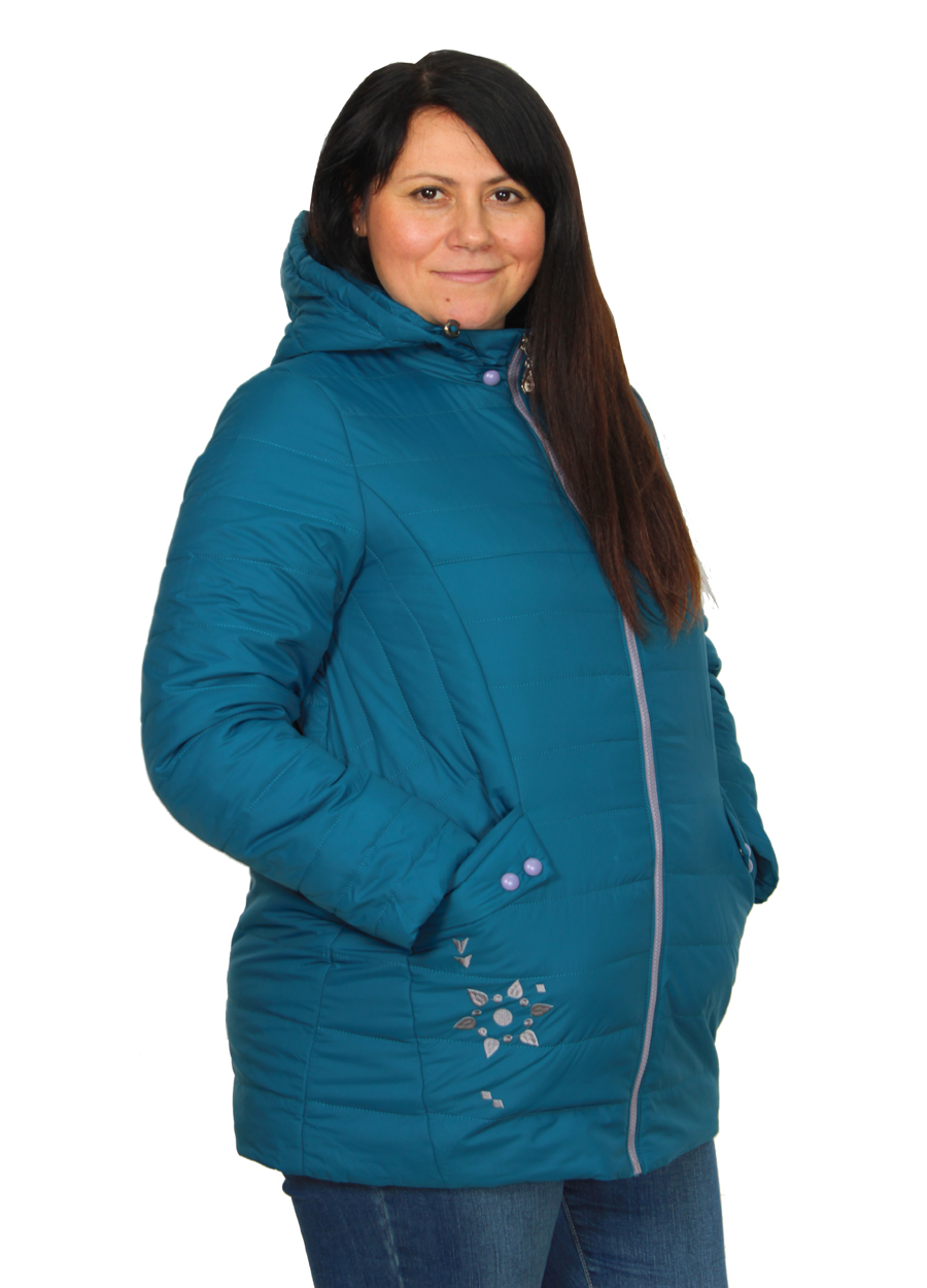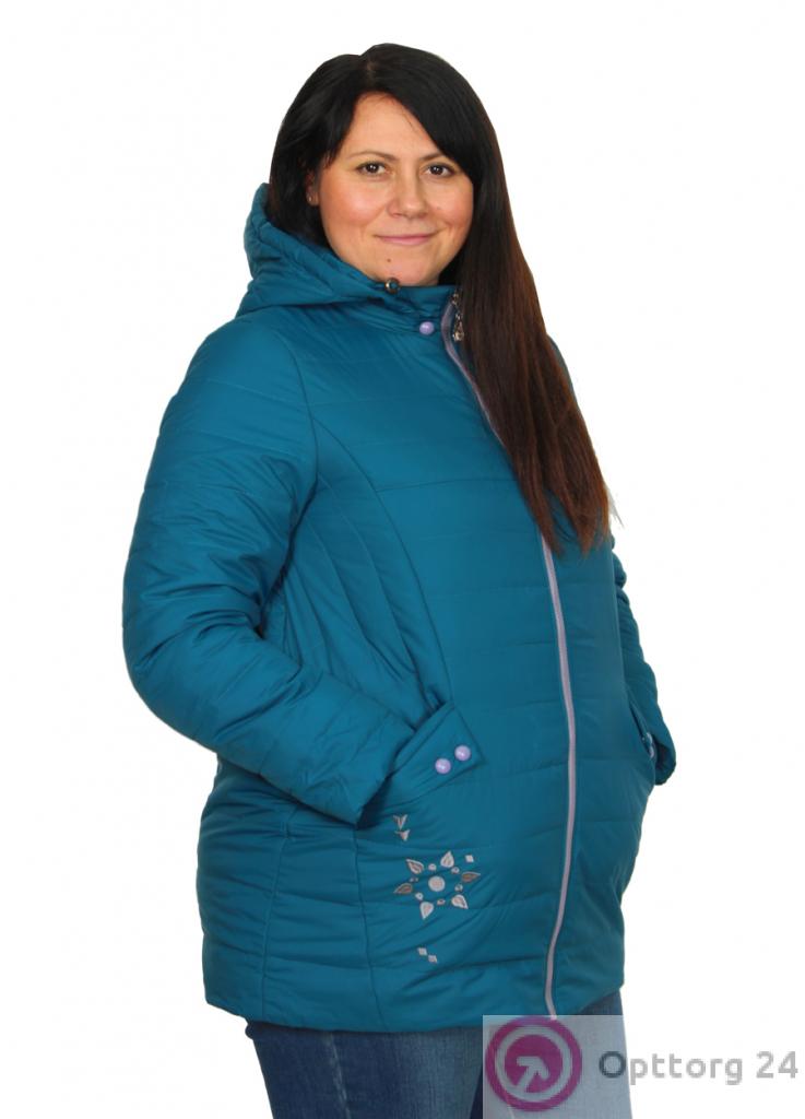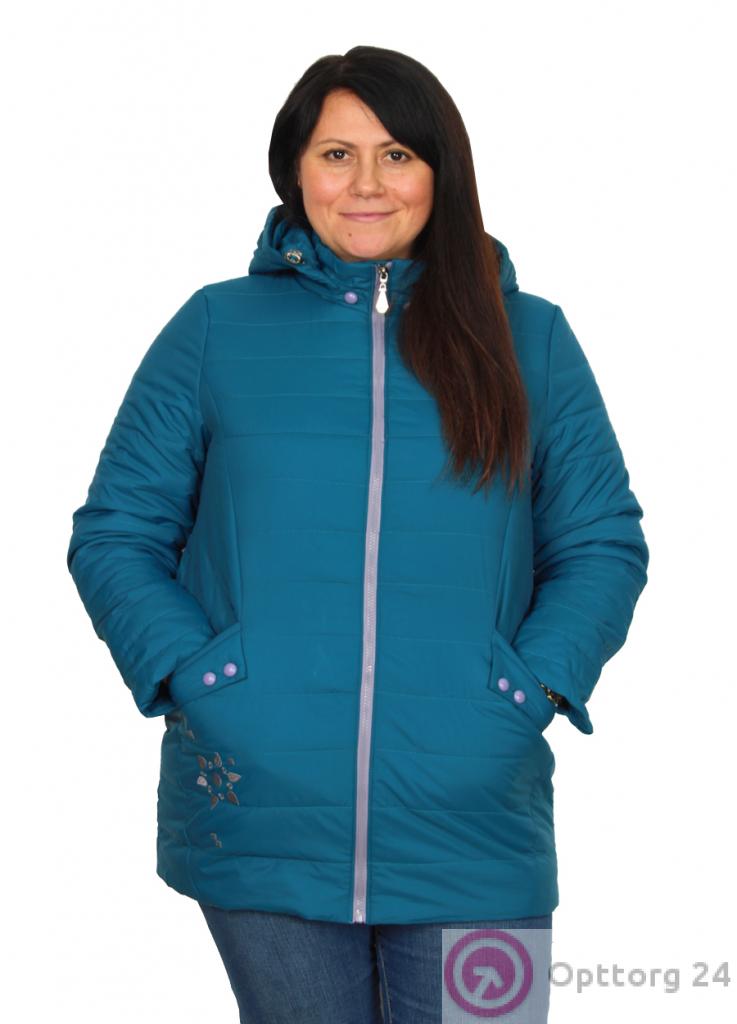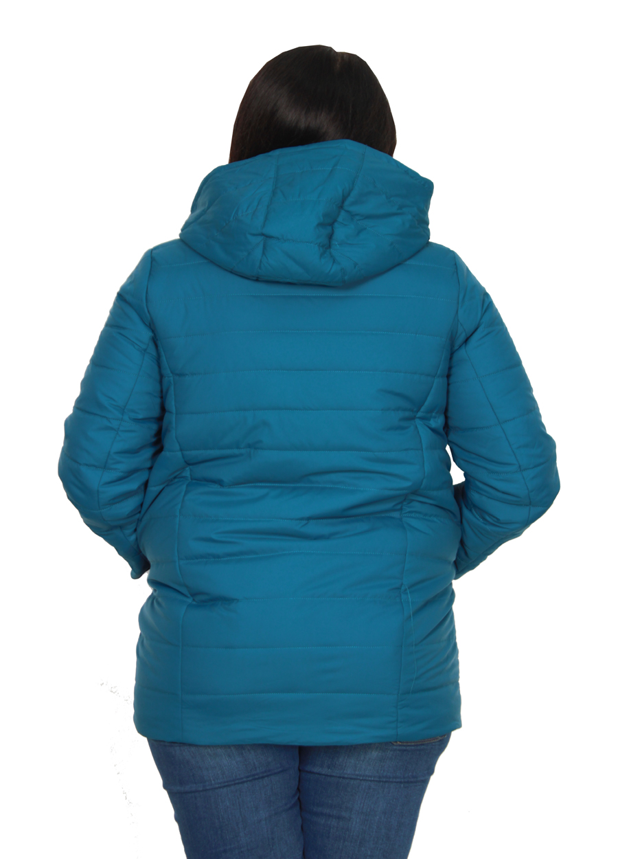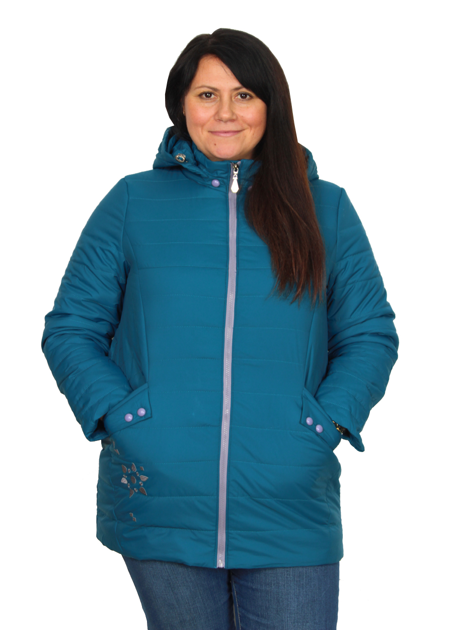 Женская куртка приятного бирюзового цвета демисезонная. Изделие имеет застежку-молнию, карманы с декоративными пуговицами, удобный капюшон и украшение под правым карманом