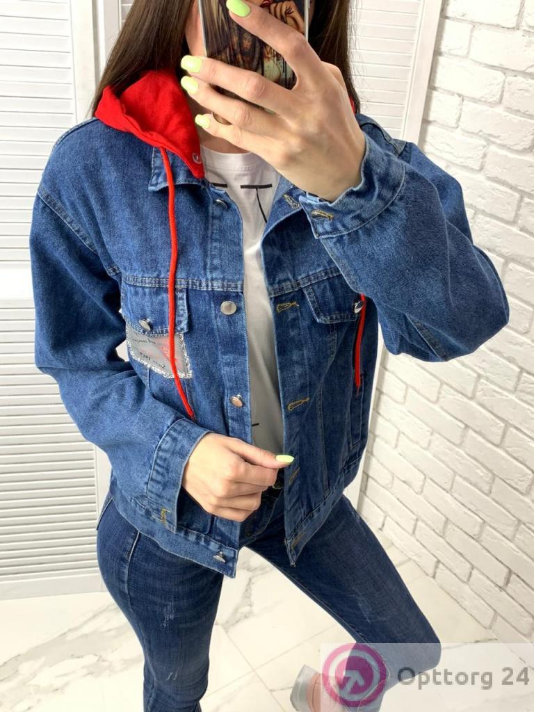 Описание: Куртка женская джинсовая с красным капюшоном, с нашивкой возле кармана. Прямого кроя. Есть два кармана на груди, застегиваются на пуговицу. У куртки застежка на пуговицах. Манжеты застегиваются на пуговицах.