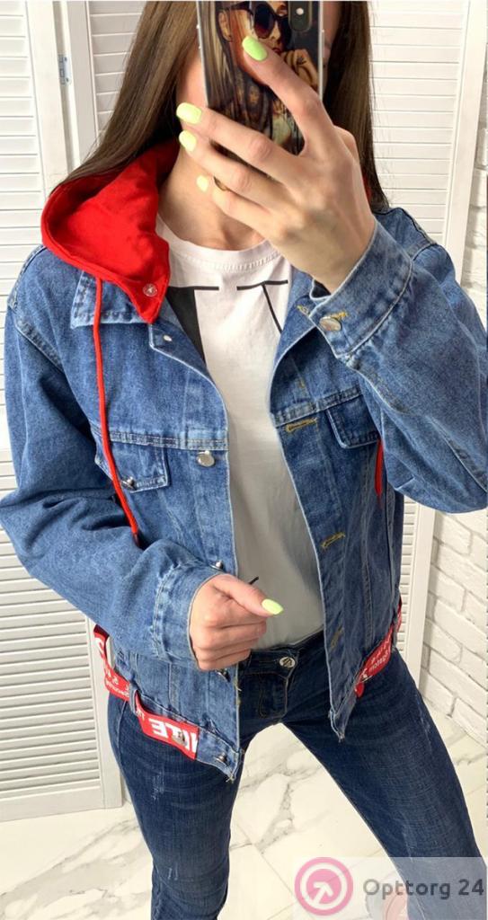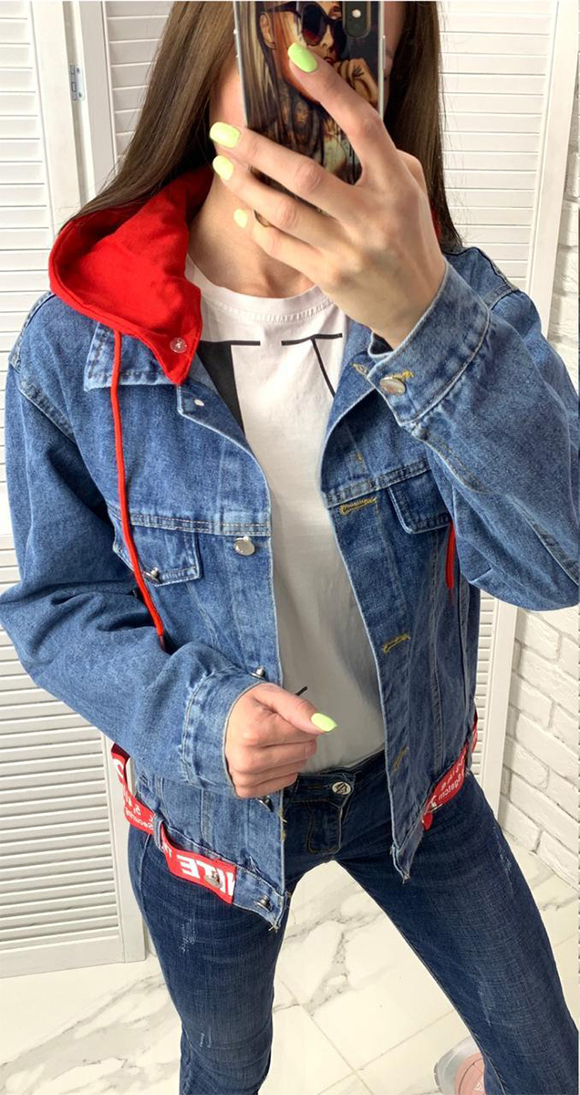 Описание: Куртка женская джинсовая с красным капюшоном, снизу с красным поясом. Прямого кроя. Есть два кармана на груди, застегиваются на пуговицу. У куртки застежка на пуговицах. Манжеты застегиваются на пуговицах.