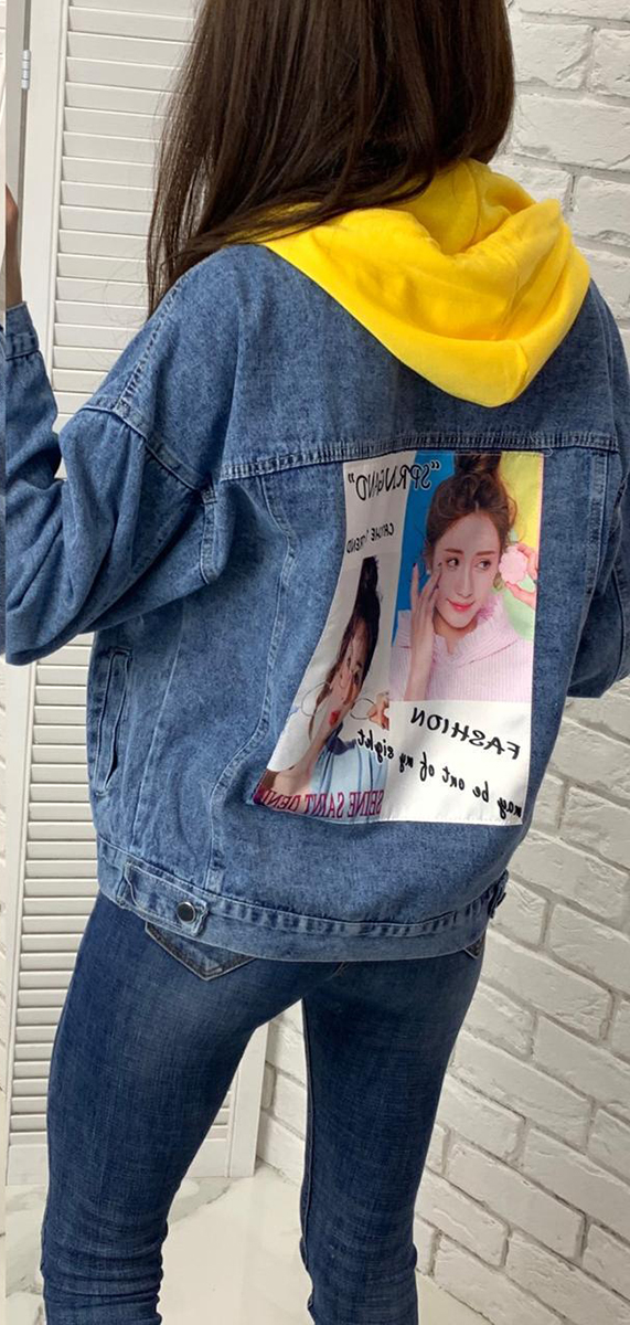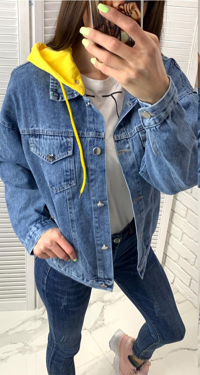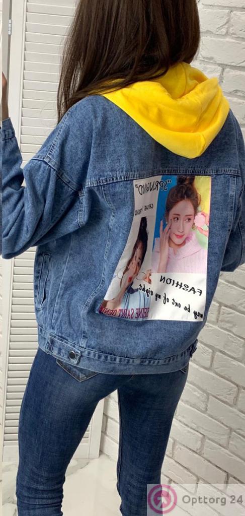 Описание: Куртка женская джинсовая с желтым капюшоном, с рисунком на спине. Прямого кроя. Есть два кармана на груди, застегиваются на пуговицу. У куртки застежка на пуговицах. Манжеты застегиваются на пуговицах.