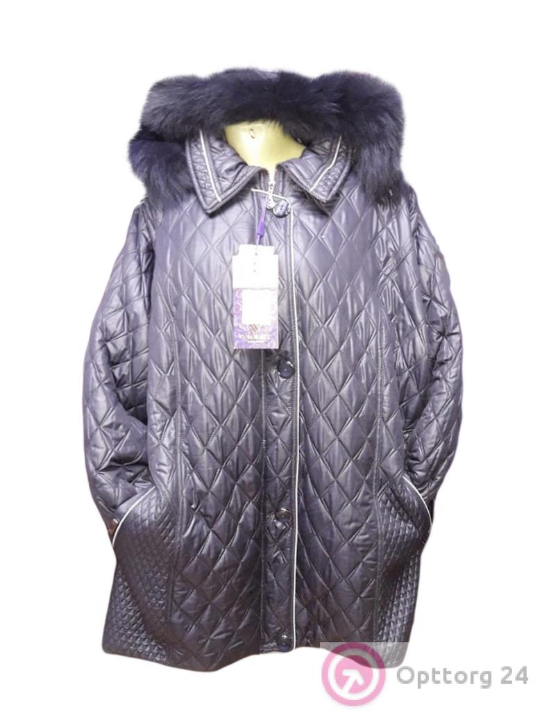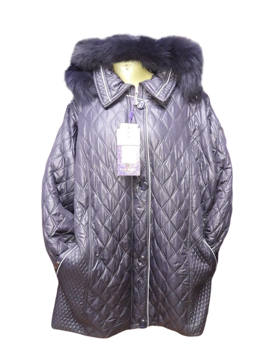 Женская стеганая куртка фиолетового цвета для женщин в холодную погоду. Модель имеет большие карманы и капюшон с мехом.