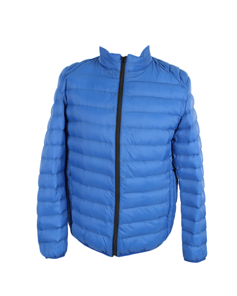 Оригинальная мужская куртка голубого цвета. В модели есть карманы на молнии. Воротник-стойка, застежка-молния.