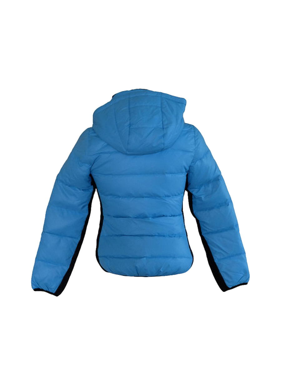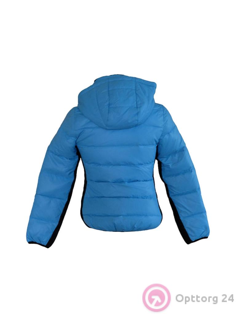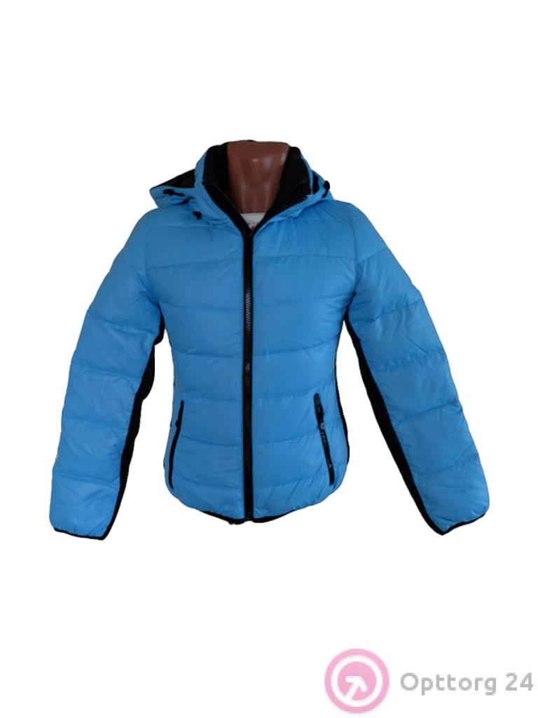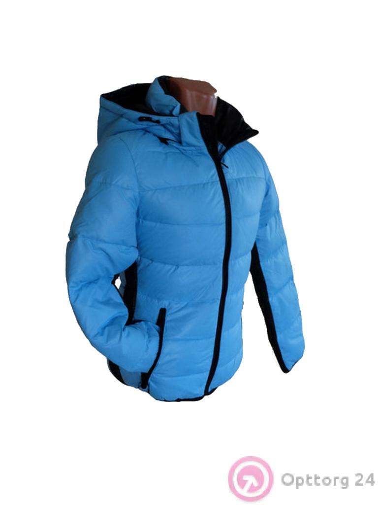 Укороченная куртка голубого цвета для женщин с карманами и капюшоном. Спереди черная пластиковая молния.
