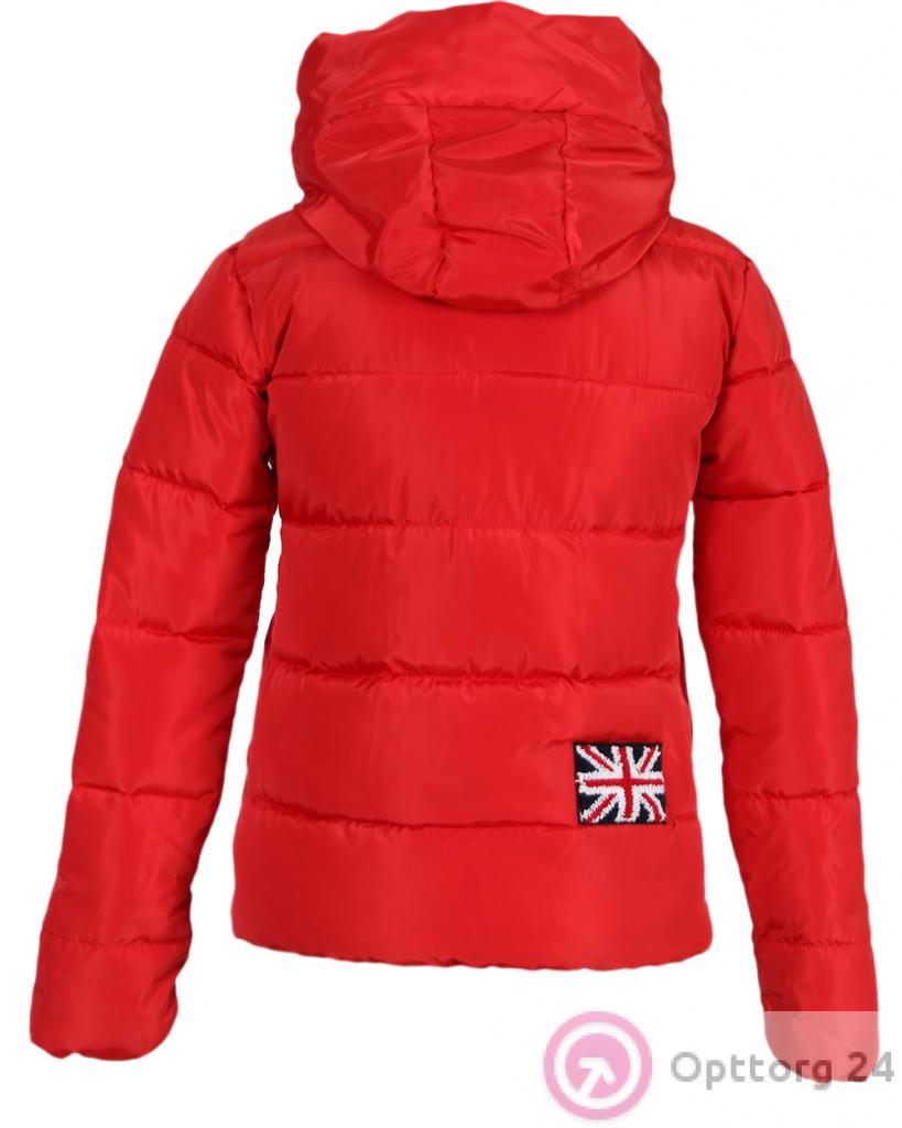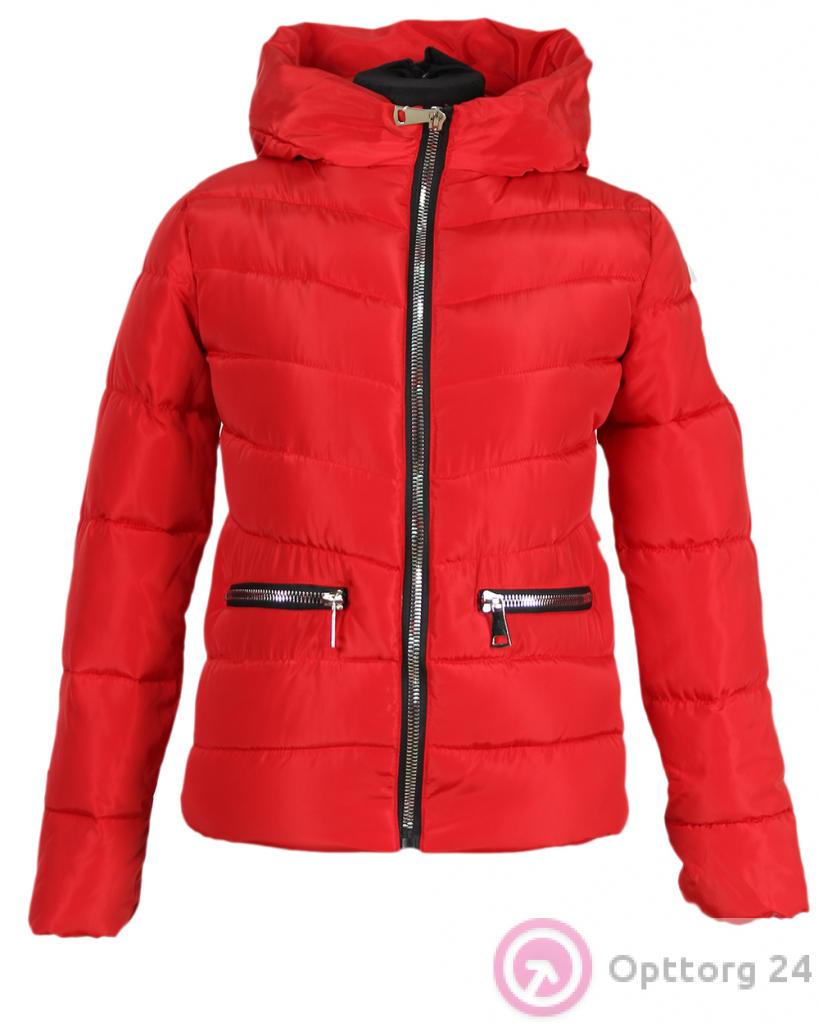 Яркая денская куртка красного цвета. Есть капюшон, два кармана на молнии.Молния окантована черной полоской.