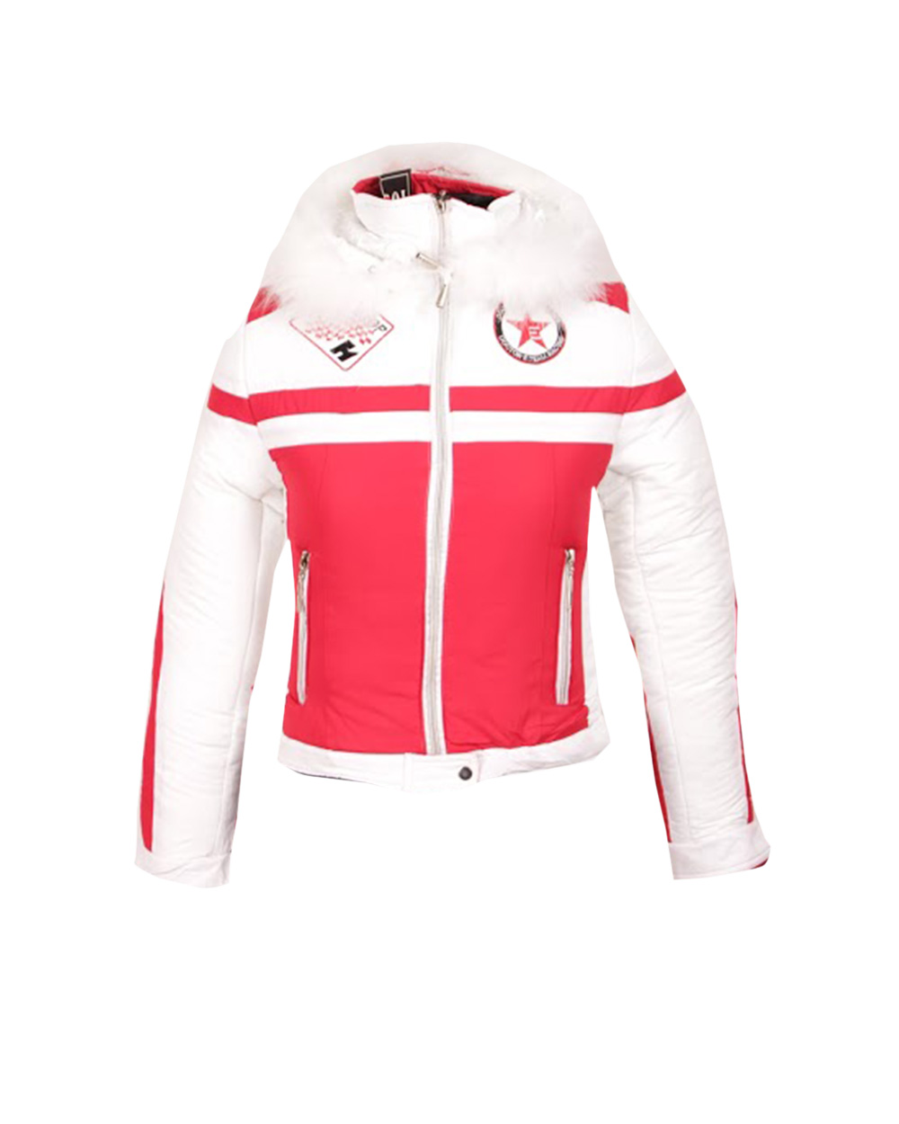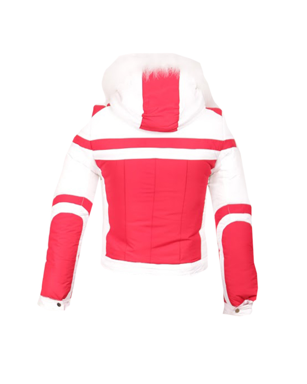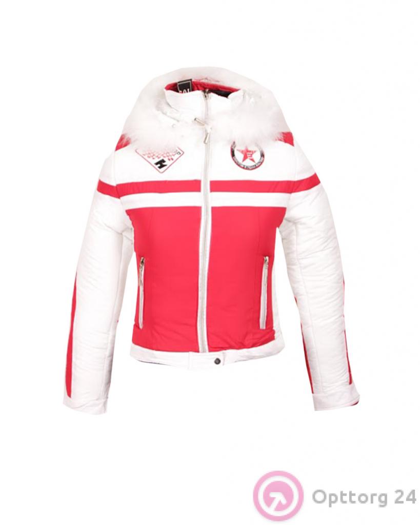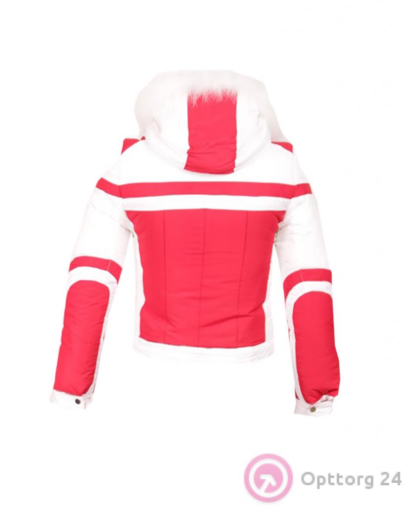 Современная и стильная куртка для женщин. Яркий красный цвет разбавлен мягкими белыми вставками. Изделие имеет капюшон с меховой опушкой.