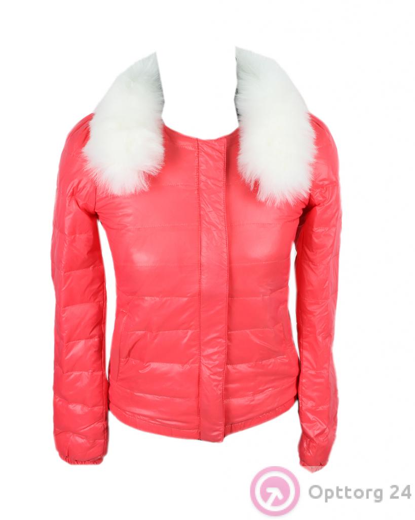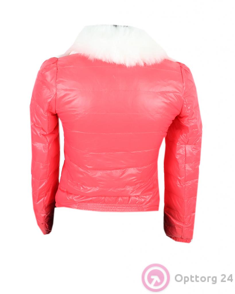 Женская куртка яркого красного цвета с контрастной меховой опушкой белого цвета. Молния прикрыта ветрозащитной планкой.