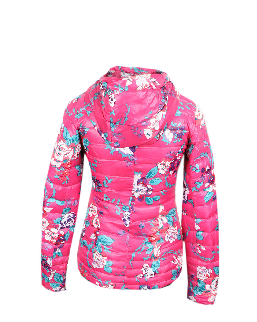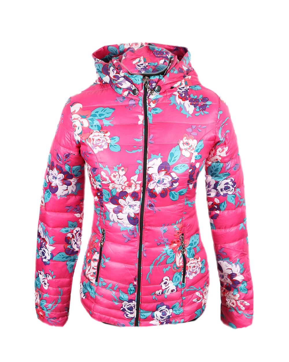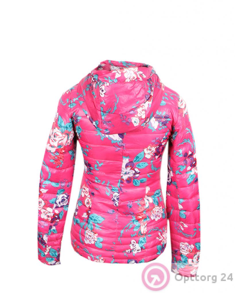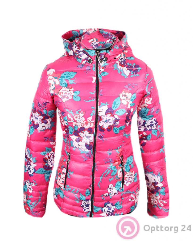 Яркая женская куртка розового цвета с цветочным принтом. Модель прострочена по всей длине. Изделие имеет капюшон.