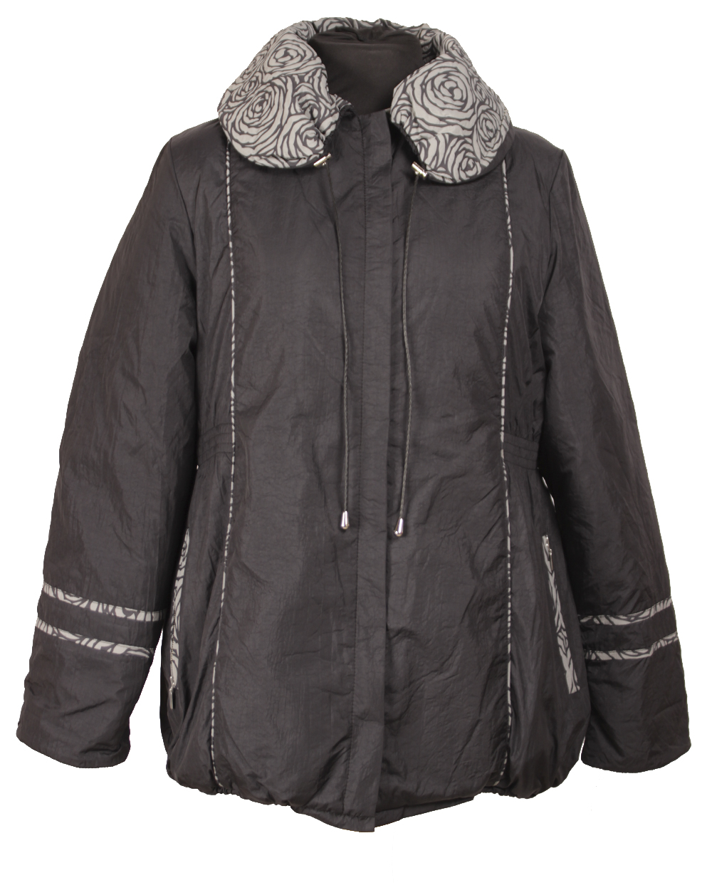 Женская куртка чёрного цвета ссерыми вставками в виде роз. Плотная ткань не продувается ветром. Удобная лёгкая модель прекрасно подойдёт для вечерних прогулок по городу.