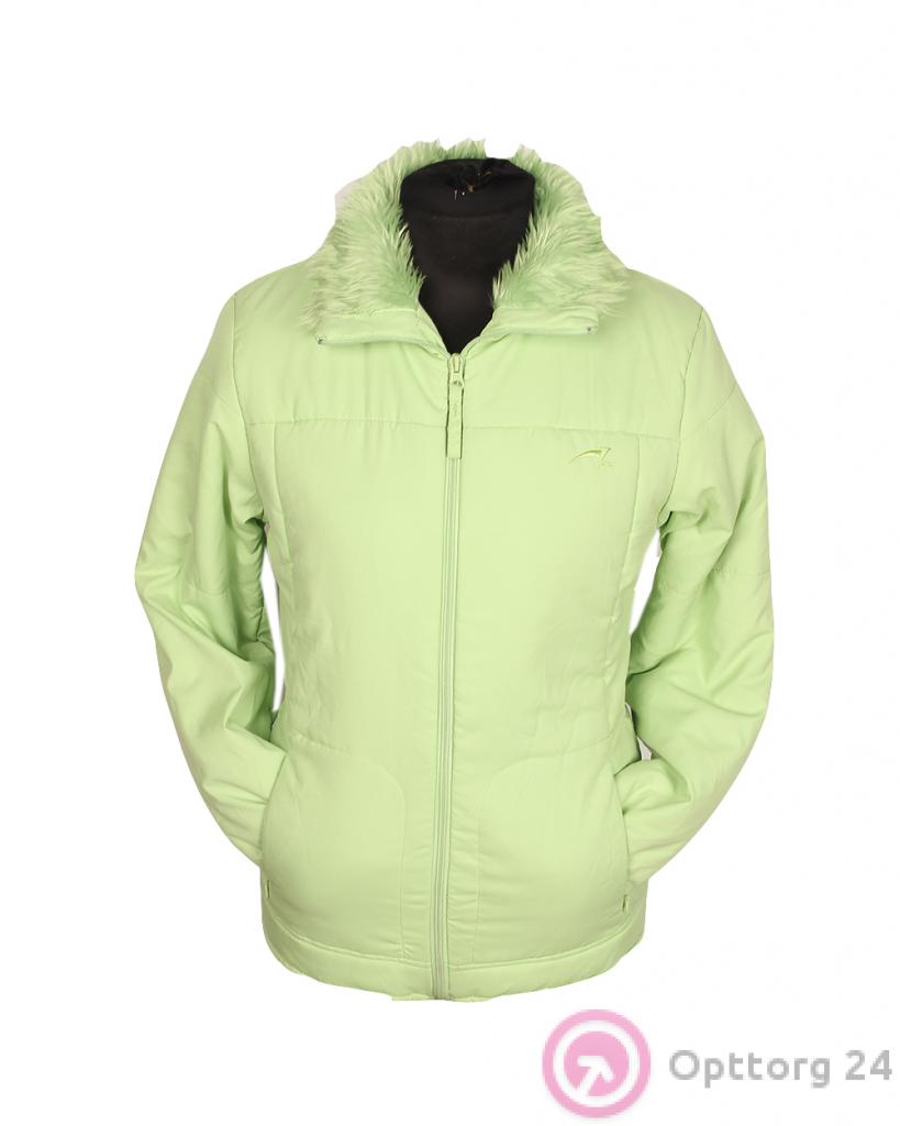 Укороченная куртка мягкого салатового цвета. Воротник отложной и украшен меховой опушкой. В изделии предусмотрено два неглубоких кармана.