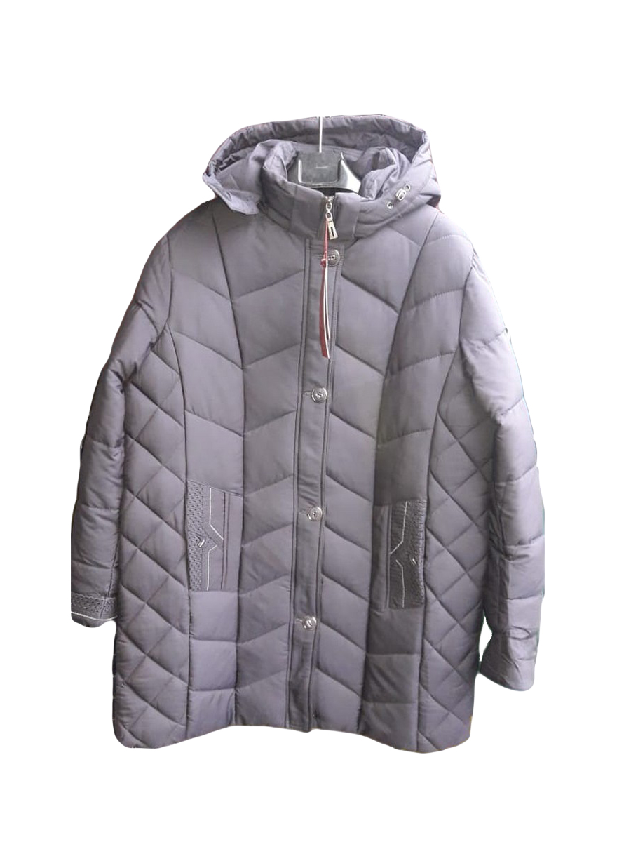 Стеганая куртка серого цвета для женщин длиной выше колена. Модель свободного кроя. Имеются карманы и капюшон.