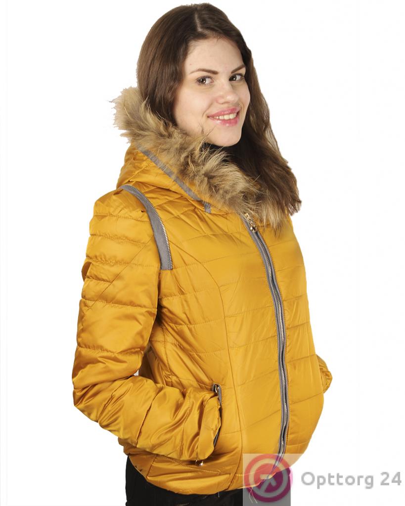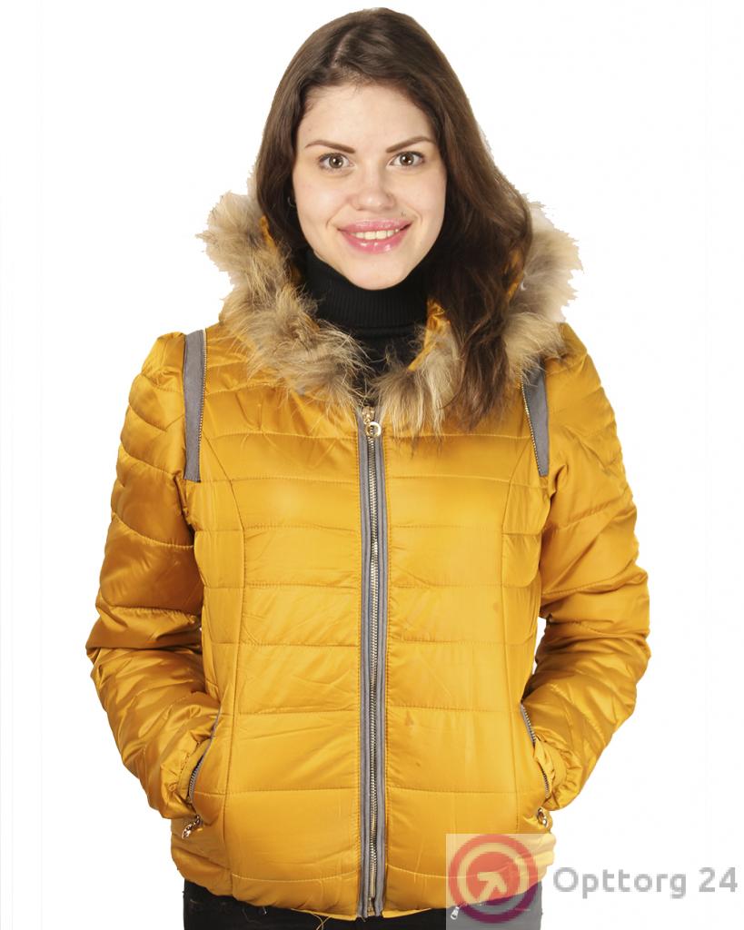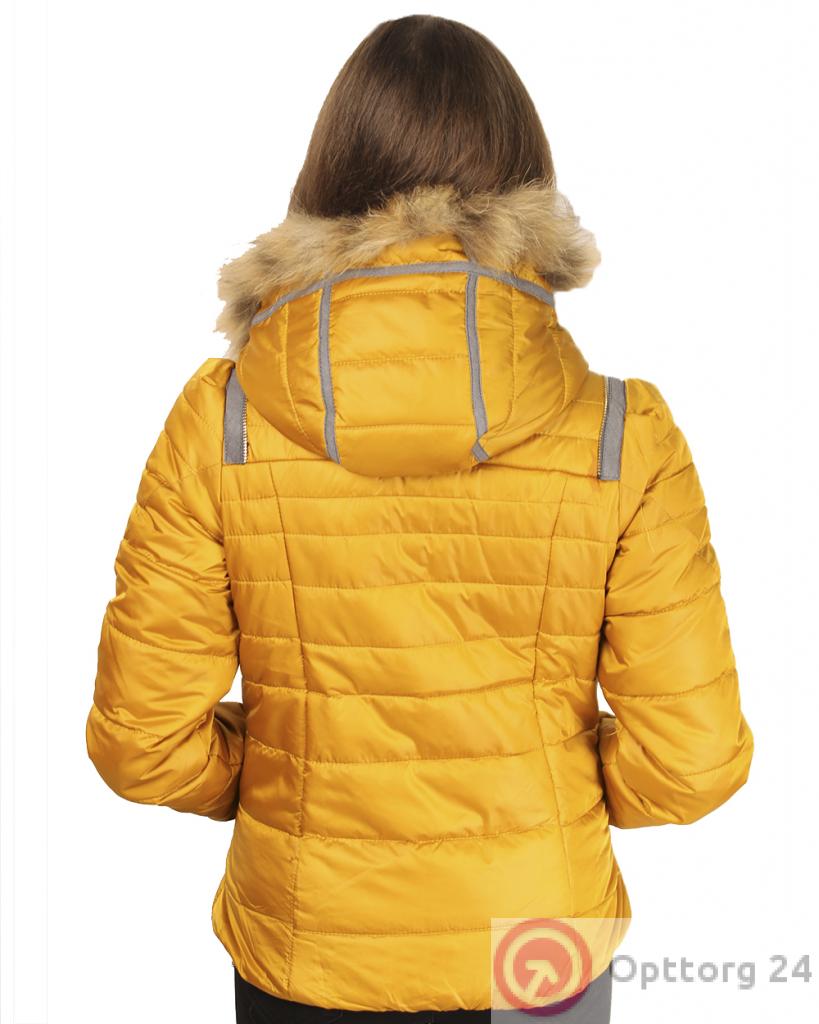 Куртка женская жёлтого цвета с натуральным мехом на капюшоне. оптом