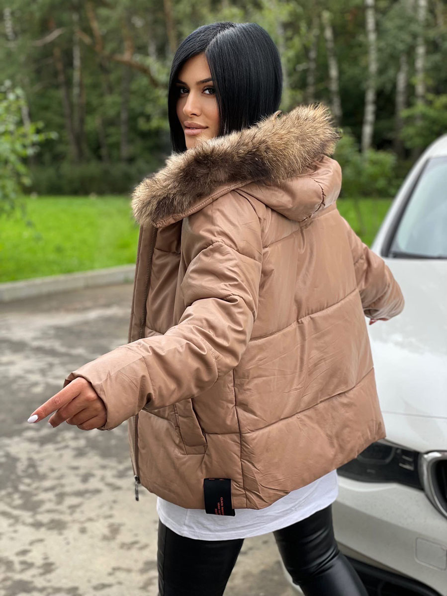 Описание: Куртка женская зимняя эко-кожа, песочного цвета. Застежка на молнии. Есть два кармана. Капюшон декорирован натуральным мехом.