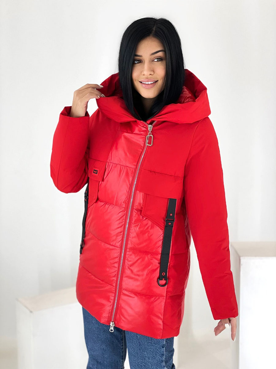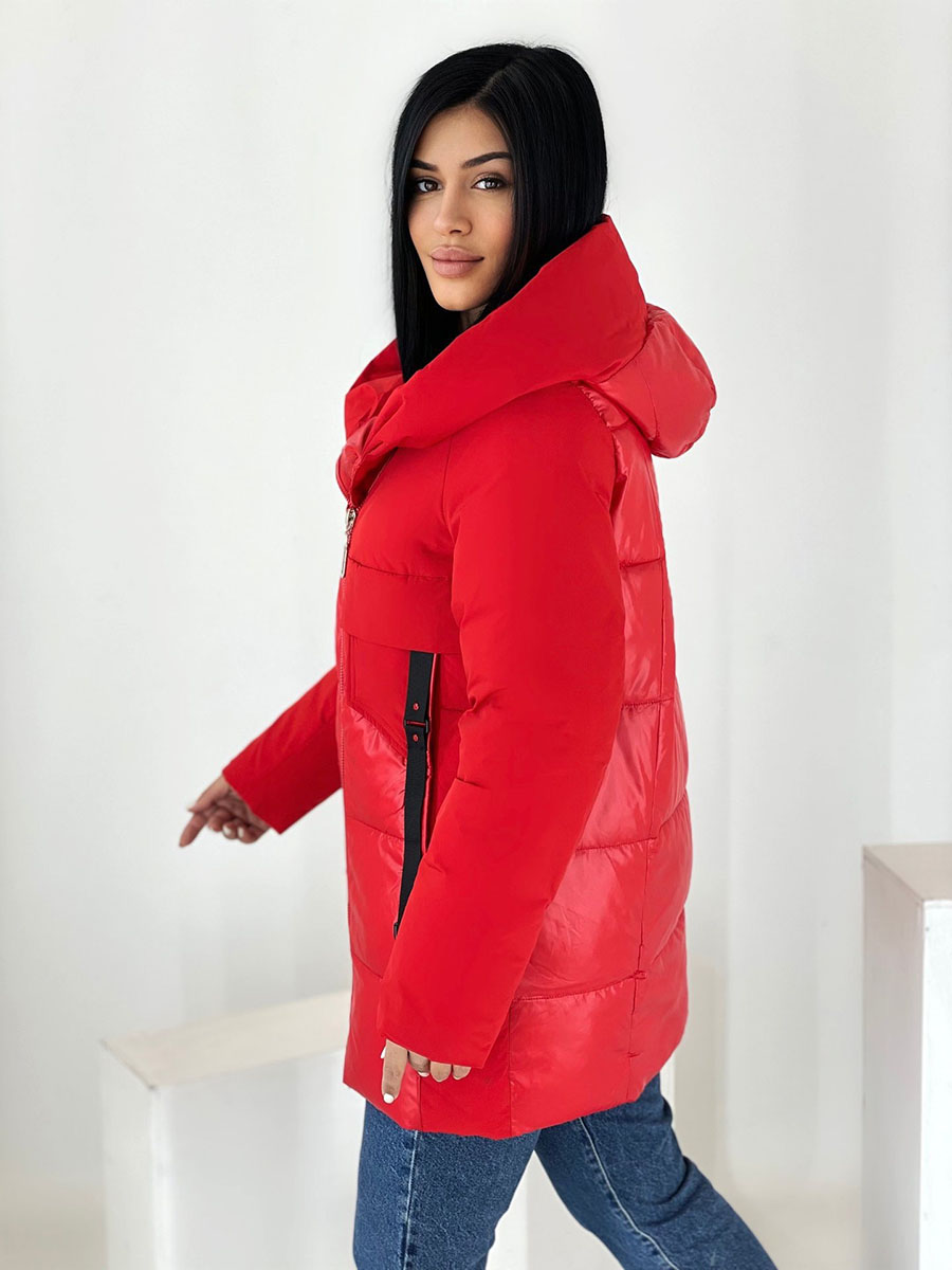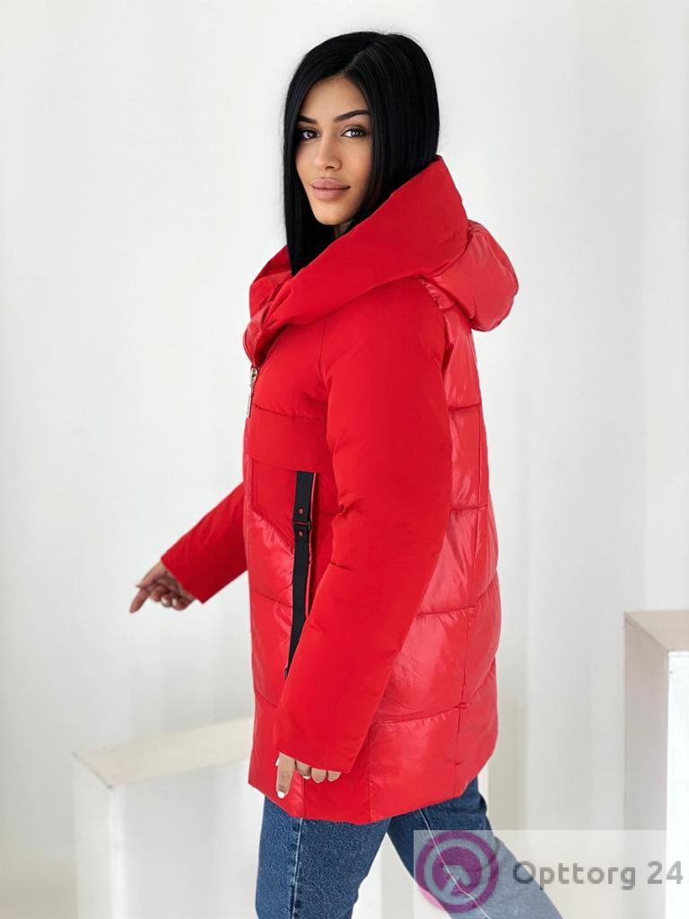 Описание: Куртка зимняя женская алого цвета, удлиненная. Высокий воротник. Есть капюшон. Застежка на двухсторонней молнии, есть карманы.