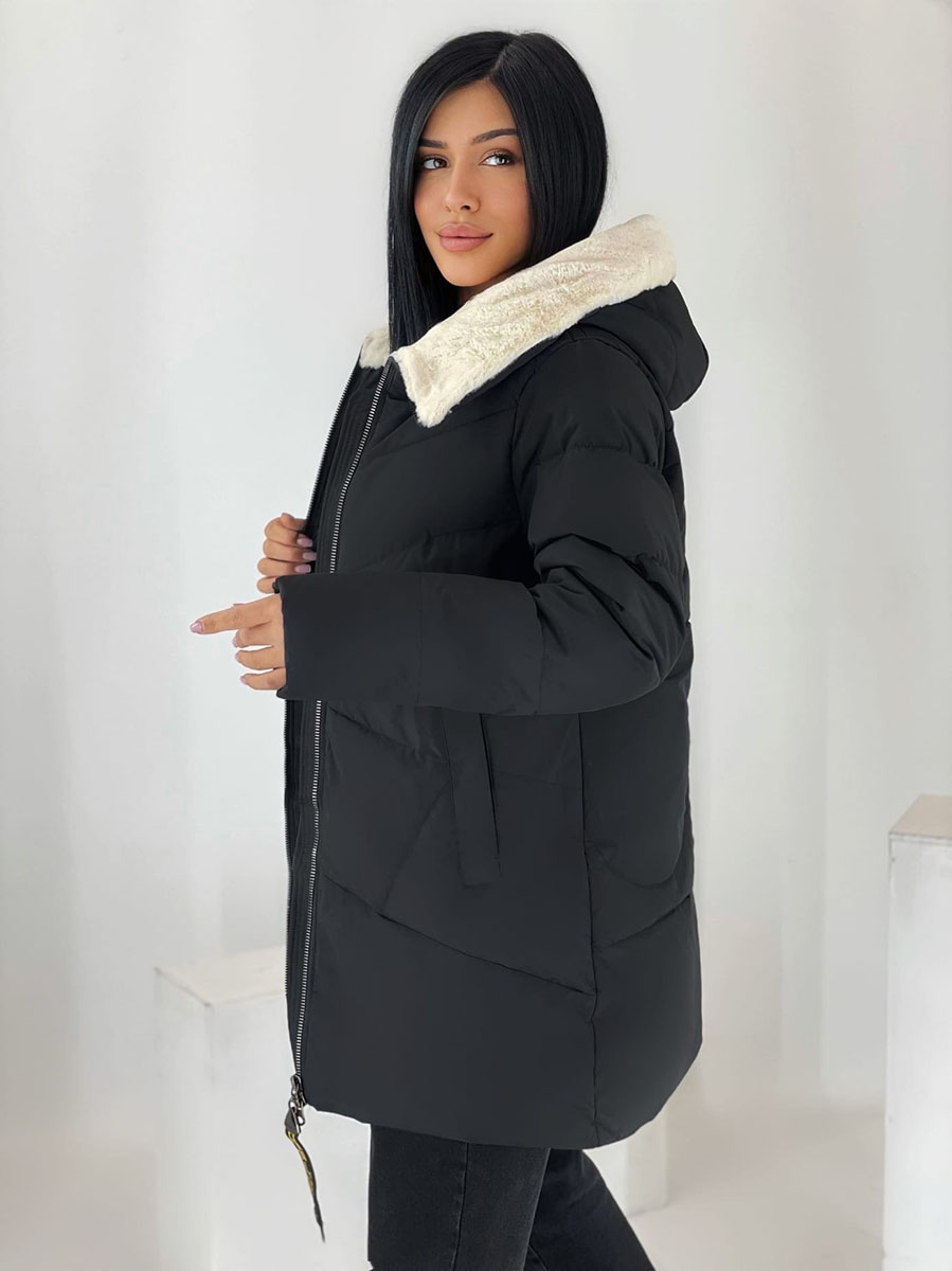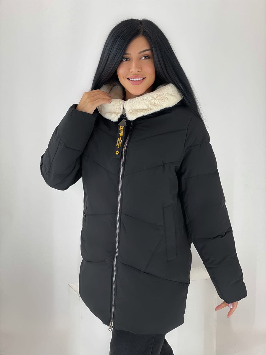 Описание: Куртка зимняя женская черного цвета. Высокий воротник декорирован искусственным мехом. Есть капюшон. Застежка на молнии, есть два кармана.