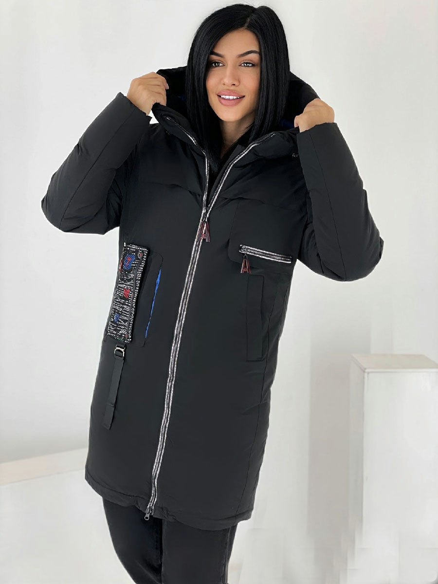 Описание: Куртка зимняя женская черного цвета. Высокий воротник. Есть капюшон. Застежка на двухсторонней молнии, есть карманы.